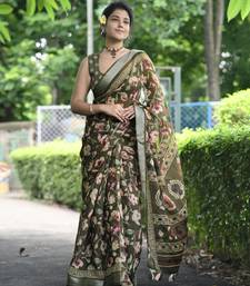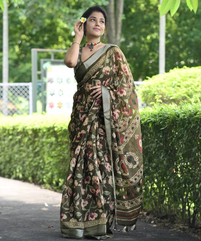 | Product Name | Mehandi Green Floral Print Zari Border Cotton Blend Saree With Unstiched Blouse Piece | |