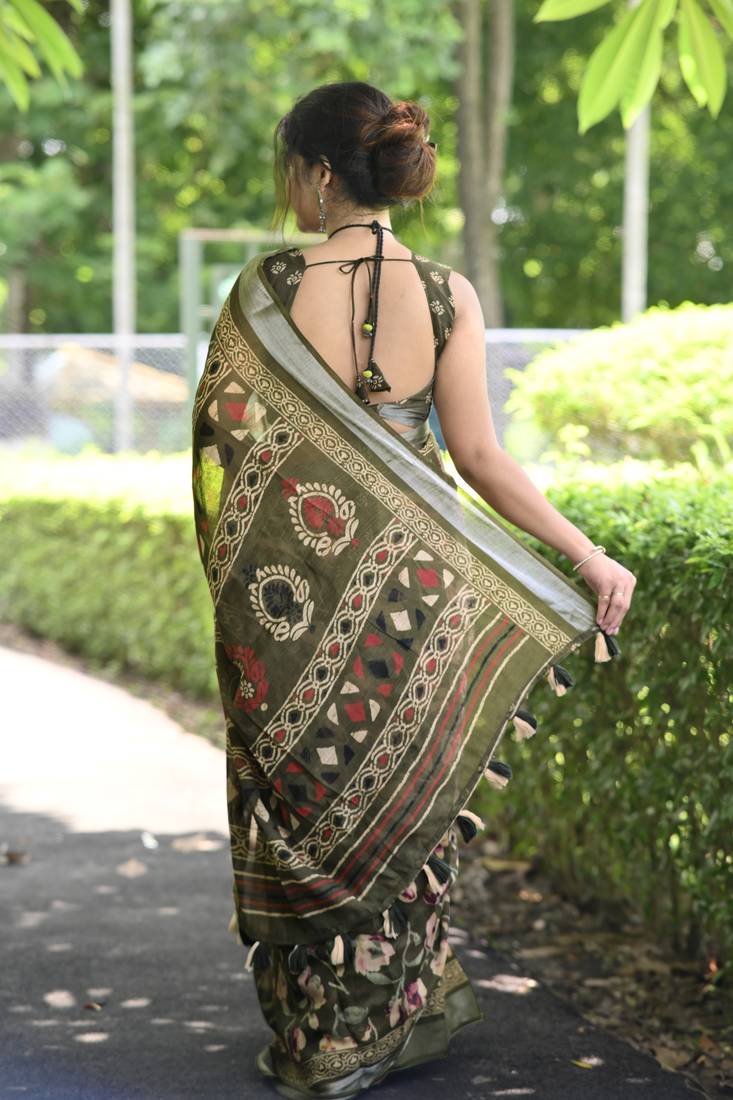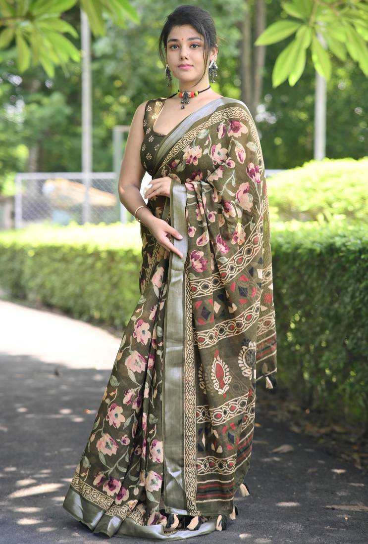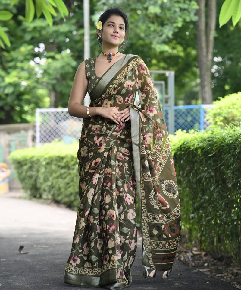 Mehandi green floral print zari border cotton blend saree with unstiched blouse piece