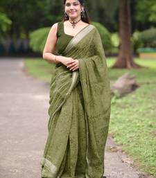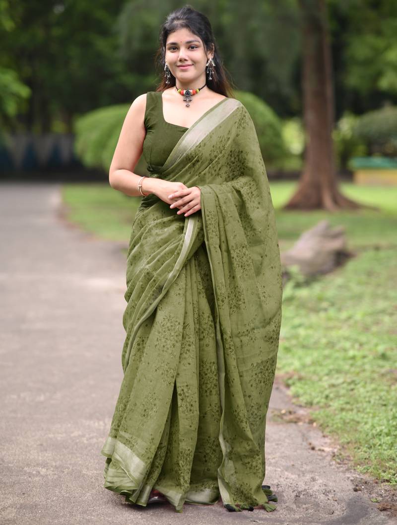 Olive green floral block print zari border cotton blend saree with unstiched blouse piece