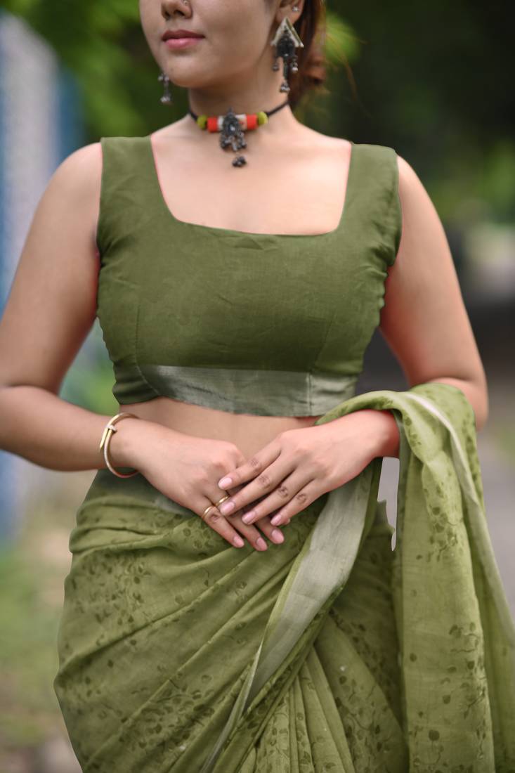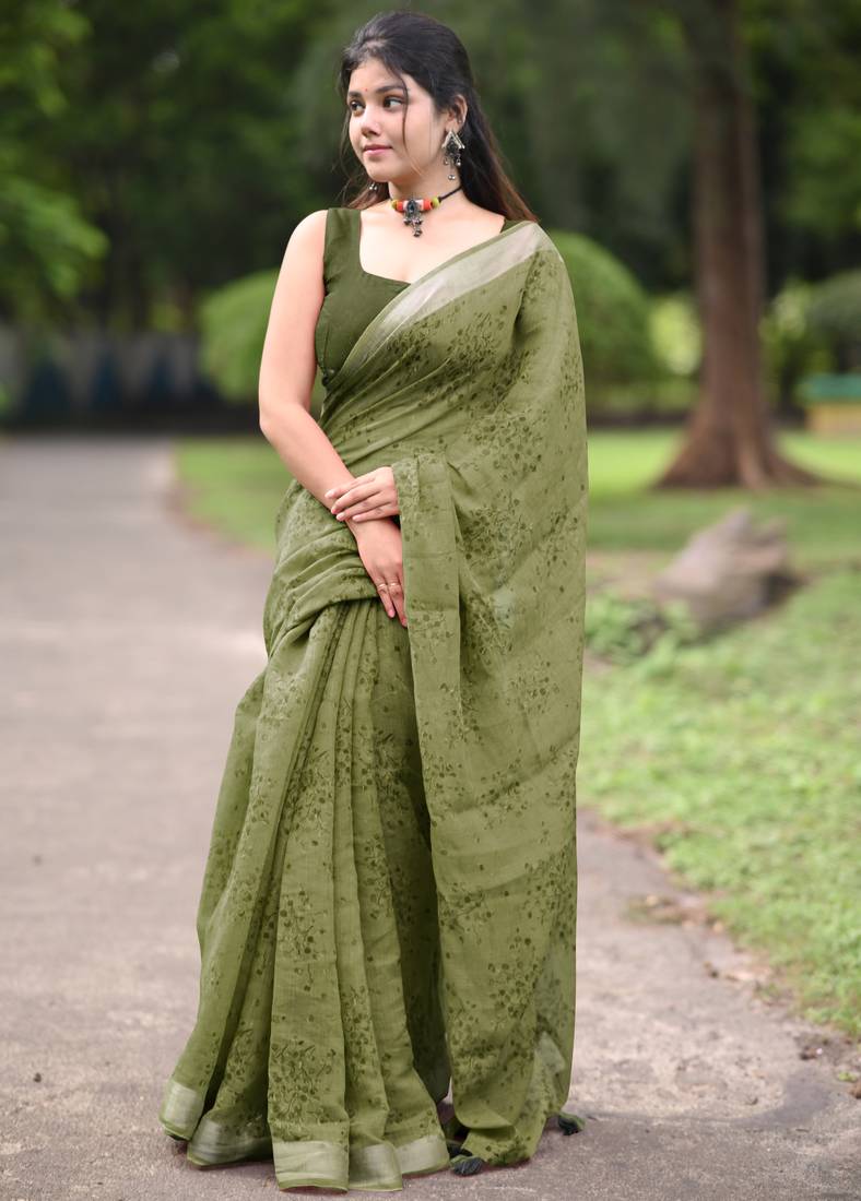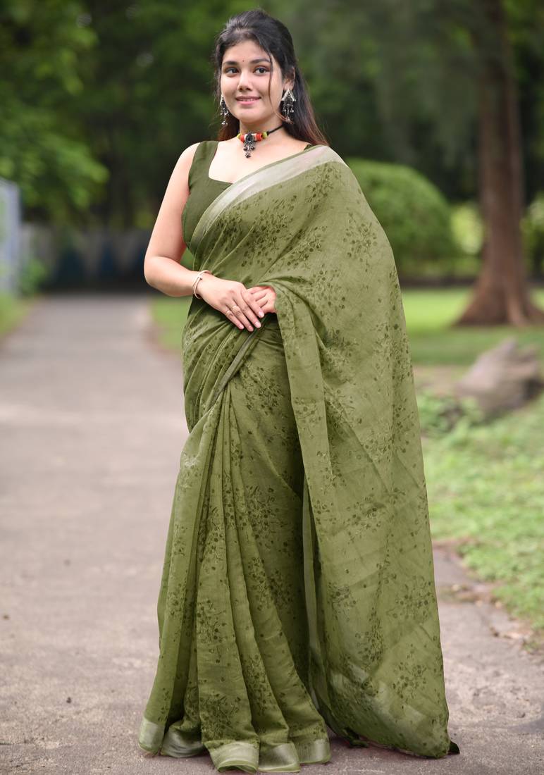 | Product Name | Olive Green Floral Block Print Zari Border Cotton Blend Saree With Unstiched Blouse Piece | |