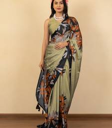 Olive green floral print chiffon saree with unstiched blouse piece