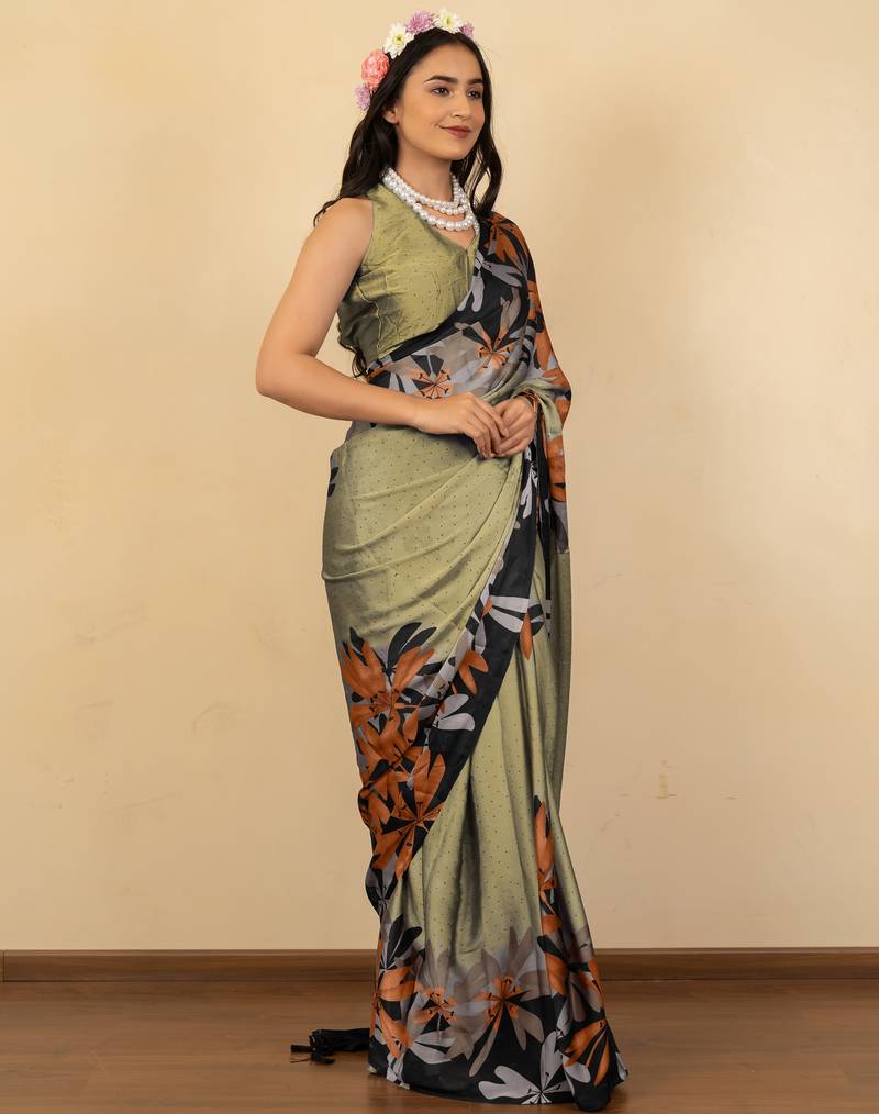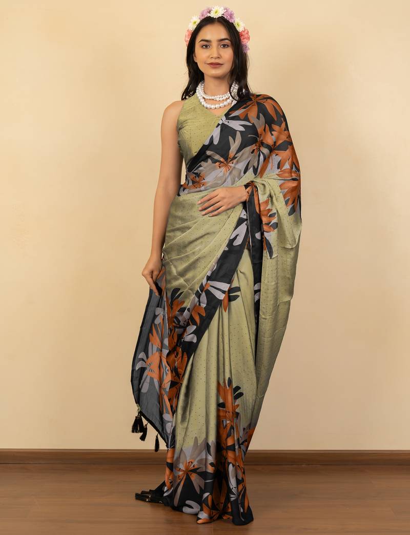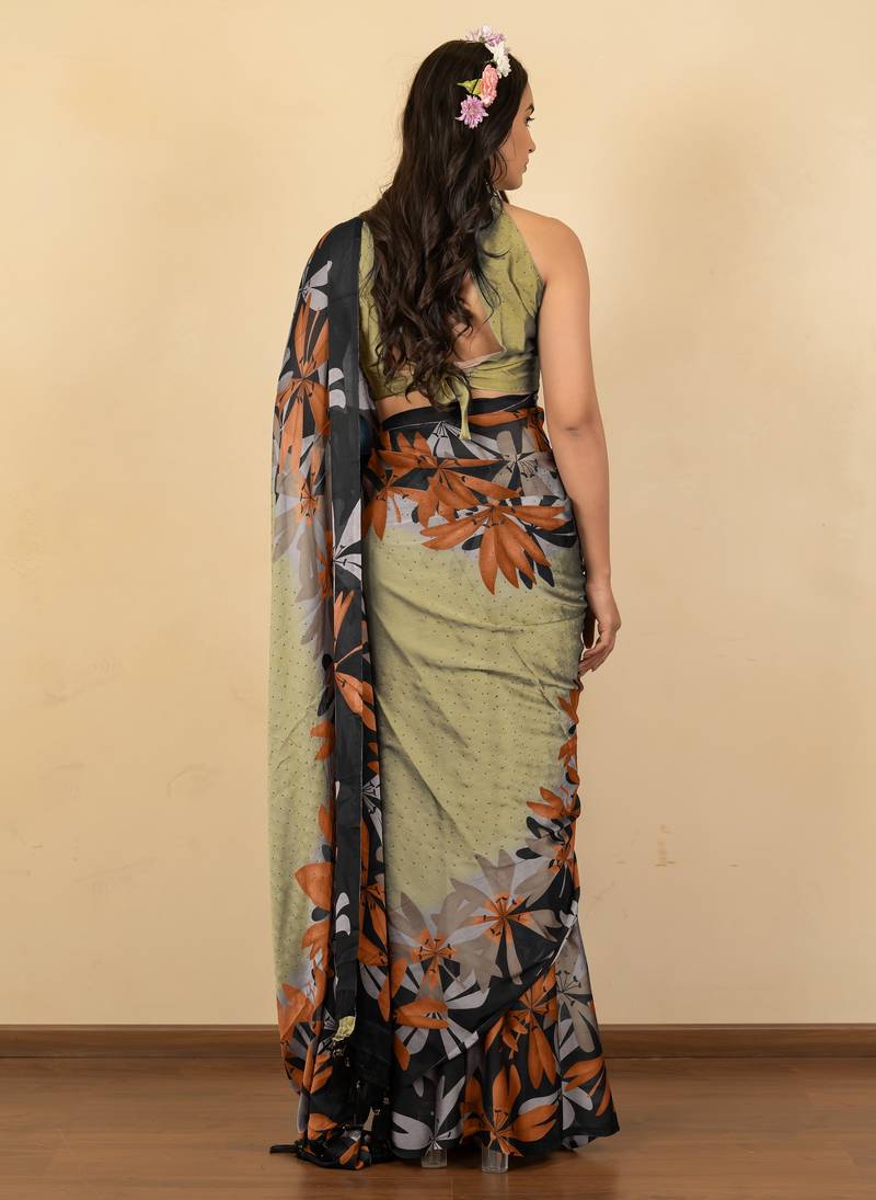 | Product Name | Olive Green Floral Print Chiffon Saree With Unstiched Blouse Piece | |