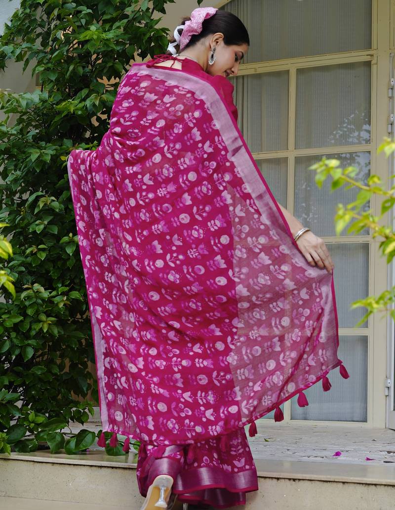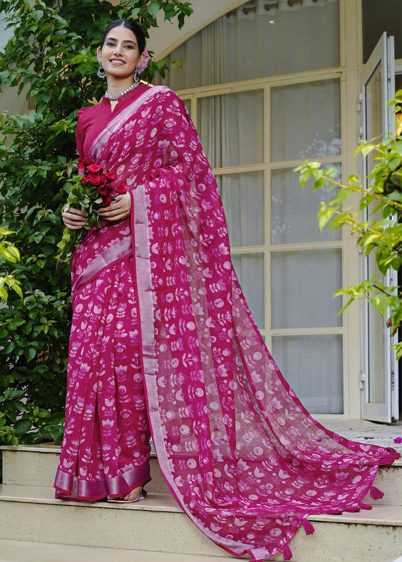 | Product Description | This Is A Dark Pink Beautifully Designed Indian Traditional Ethnic Casual/Party Wear Sarees Made Of High Quality Cotton Blend Having Beautiful All Over Design Floral Print/Block Print Zari Border With Tassels .This Saree Is A Ideal For Festivals, Parties And Social/Friends/Family Get Together, Ceremonies Or Rituals, Business Functions Wherever You Want To Flaunt Your Style. |
