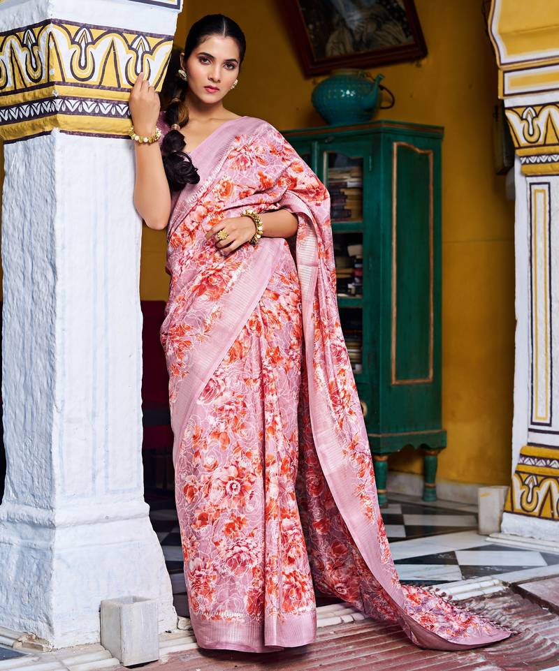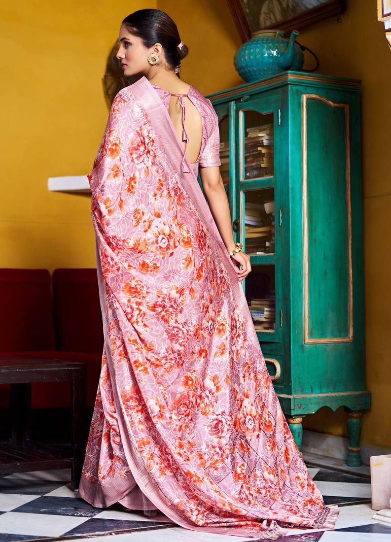 Pink floral print zari woven border silk blend saree with unstiched blouse piece