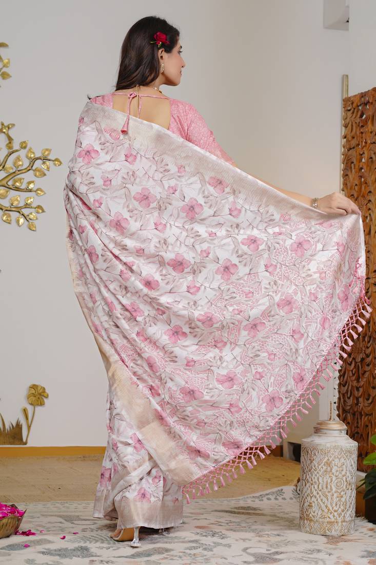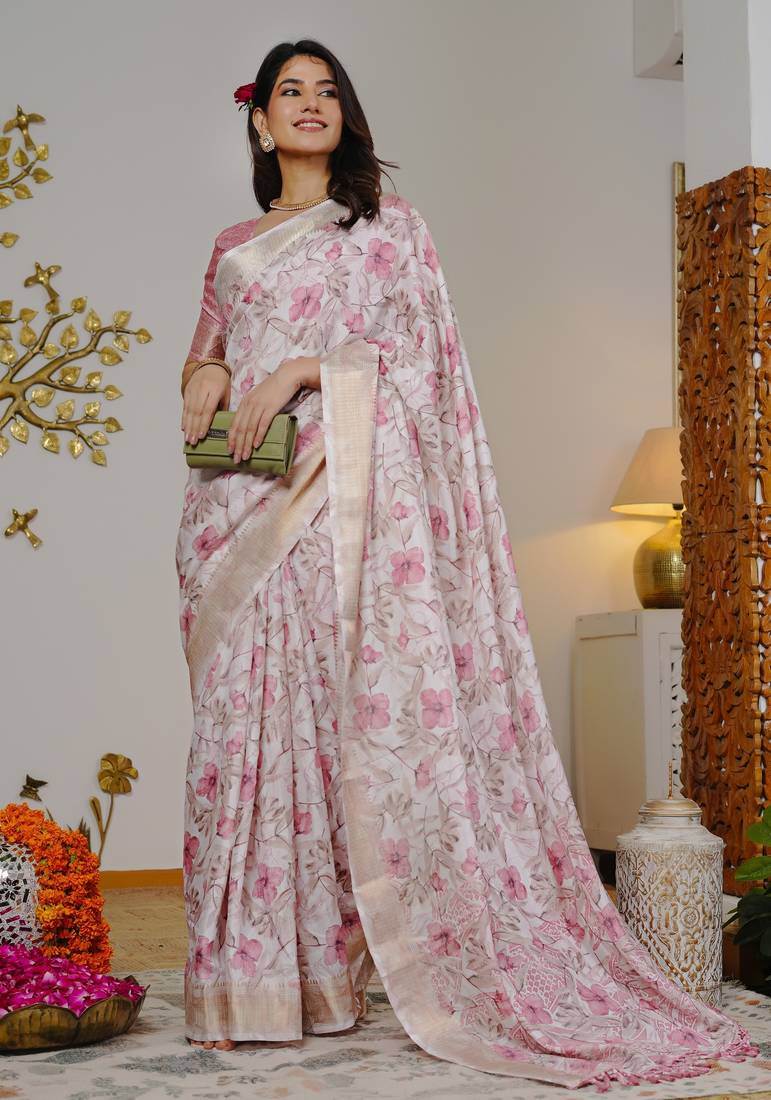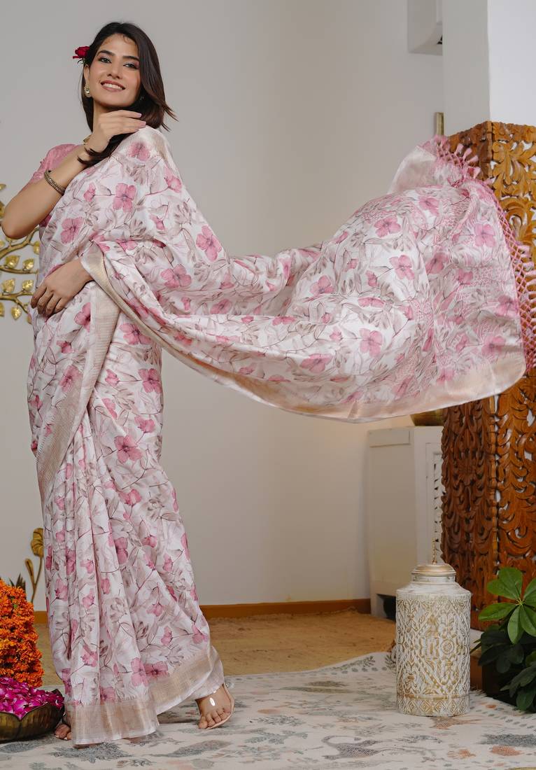 Pink floral print zari woven border silk blend saree with unstiched blouse piece
