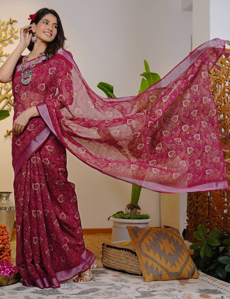 | Product Name | Pink Paisley Kalamkari Print Zari Border Cotton Blend Saree With Unstiched Blouse Piece | |