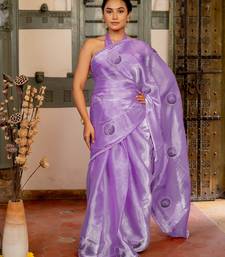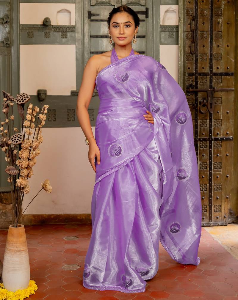 Purple stone embroidery lace border organza saree with unstiched blouse piece