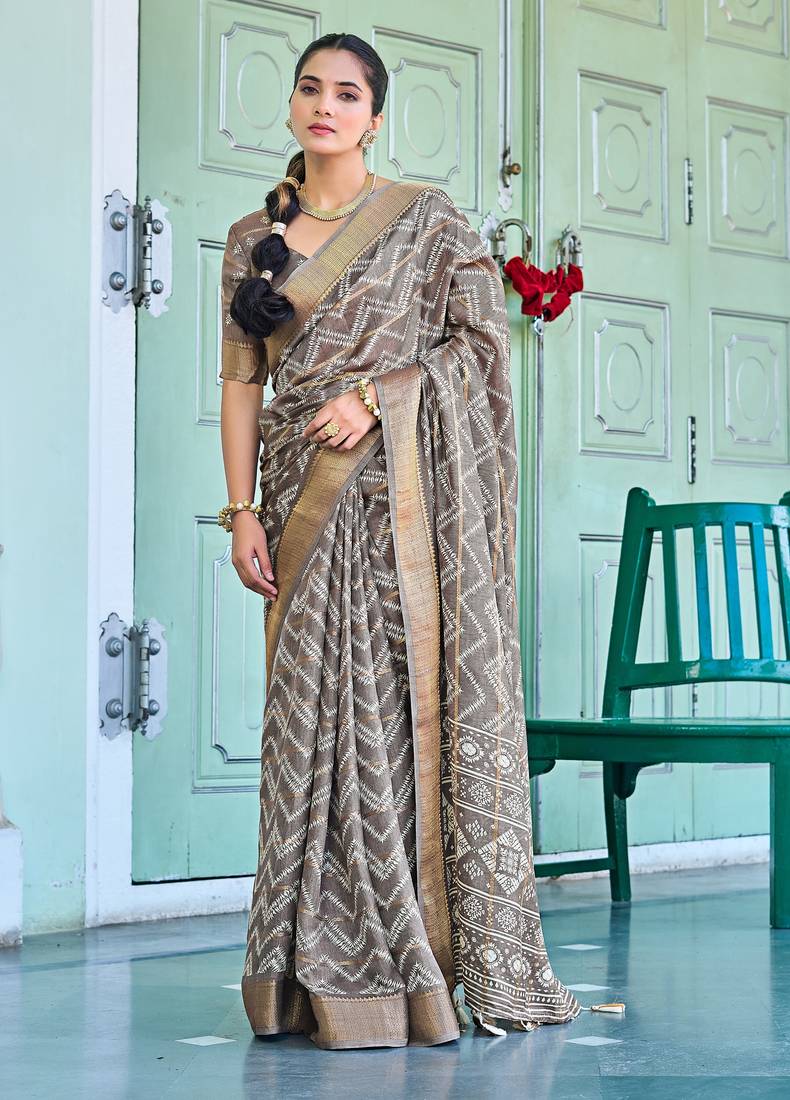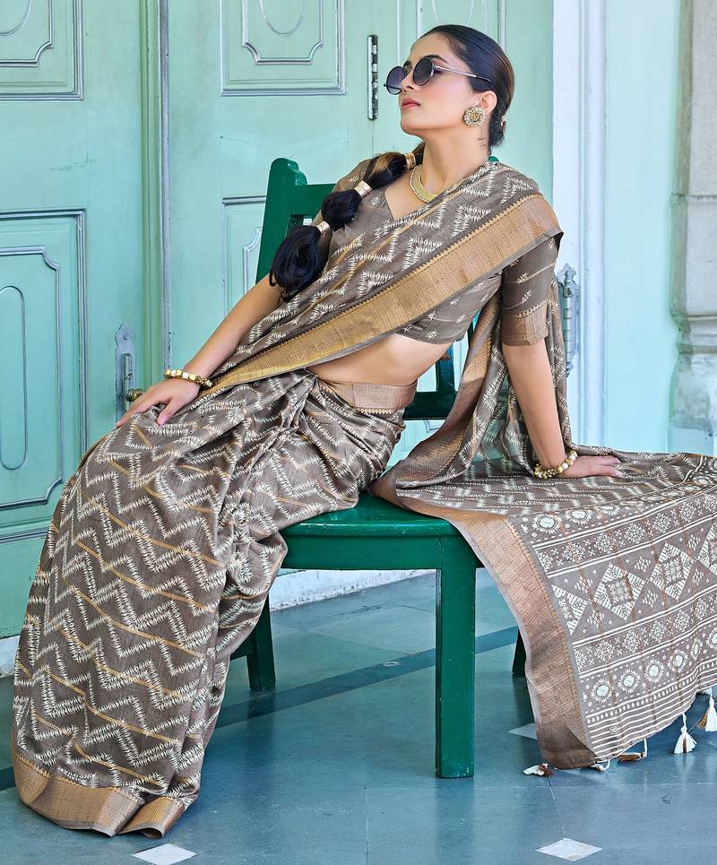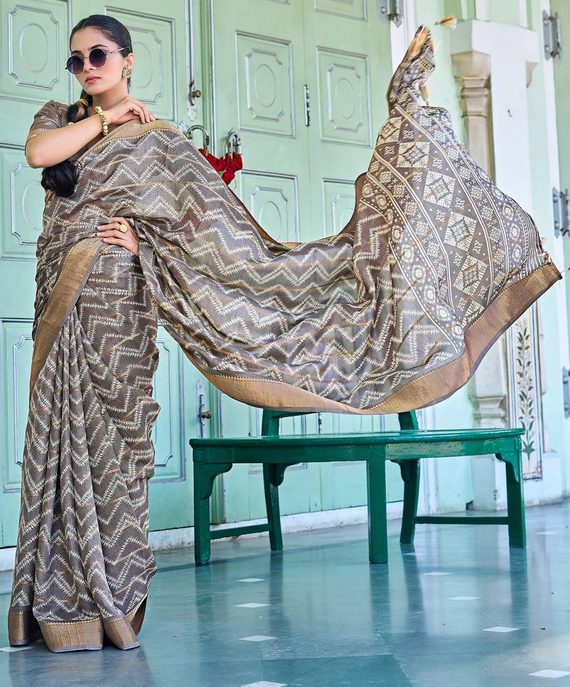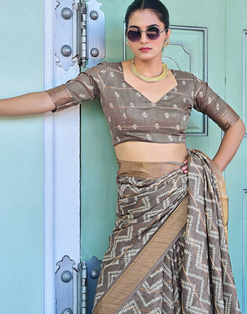 Taupe chevron print zari golden border silk blend saree with unstiched blouse piece
