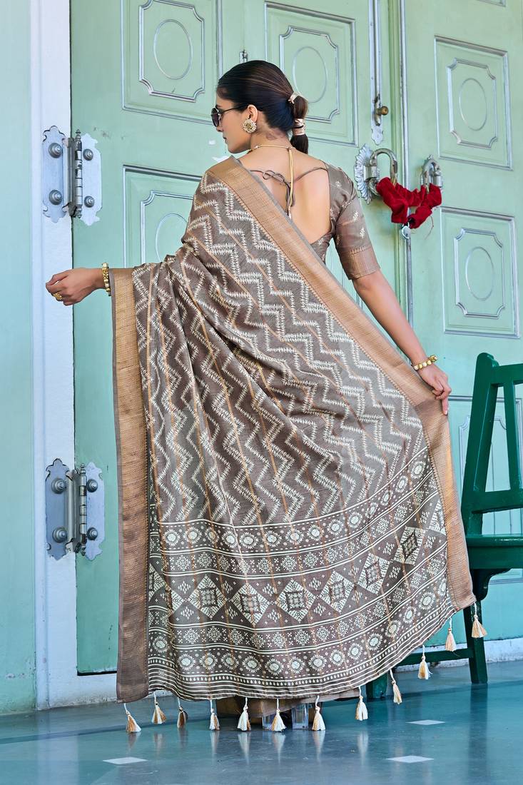 | Product Name | Taupe Chevron Print Zari Golden Border Silk Blend Saree With Unstiched Blouse Piece | |