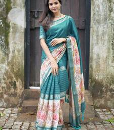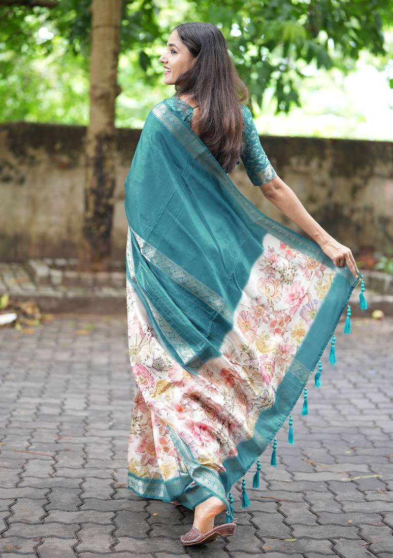 | Product Name | Turquoise Floral Print Golden Zari Border Cotton Silk Saree With Unstiched Blouse Piece | |