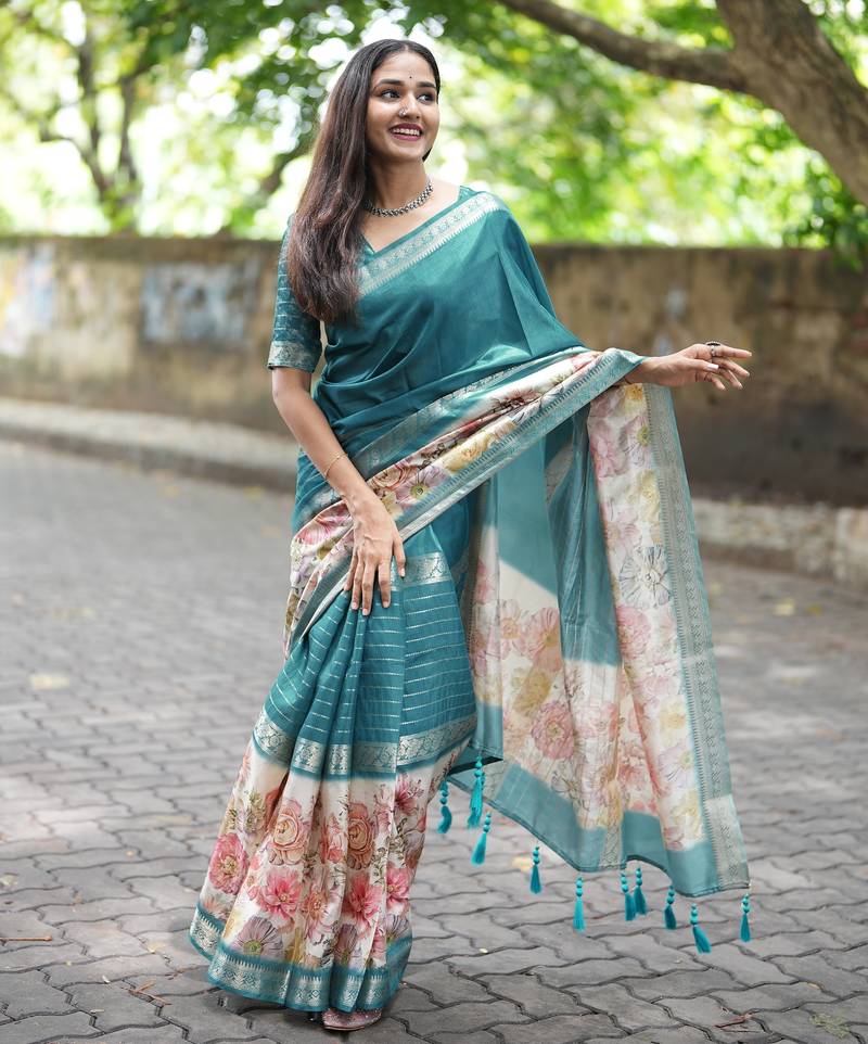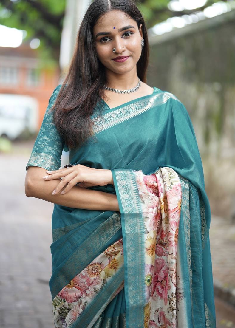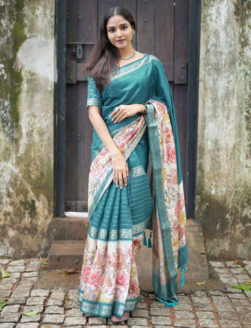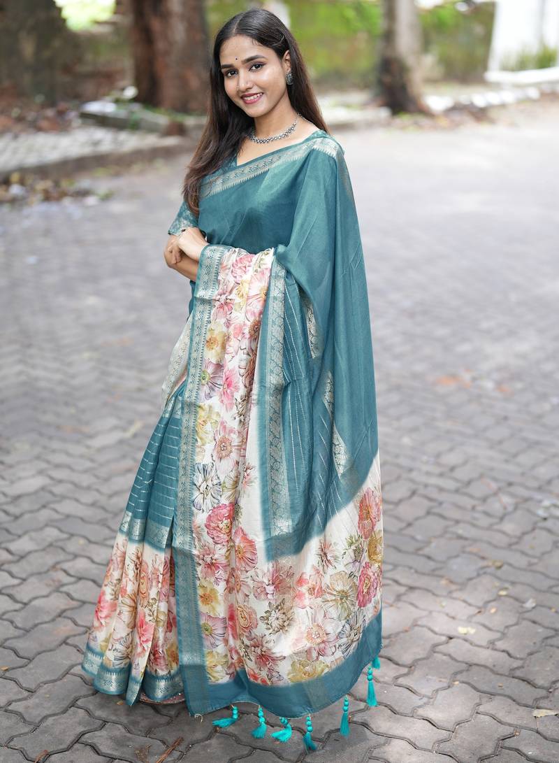 | Product Description | This Is A Dark Turquoise Beautifully Designed Indian Traditional Ethnic Party/Festive Wear Sarees Made Of High Quality Cotton Silk,Cotton Blend Having Beautiful All Over Design Floral Print/Zari Lines Golden Zari Woven Border With Tassels .This Saree Is A Ideal For Festivals, Parties And Social/Friends/Family Get Together, Ceremonies Or Rituals, Business Functions Wherever You Want To Flaunt Your Style. |