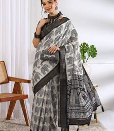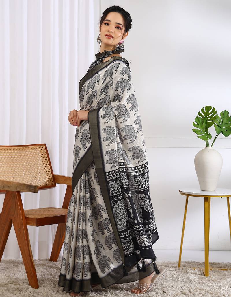 Party wear cotton blend block print saree with unstiched blouse pieceWhite