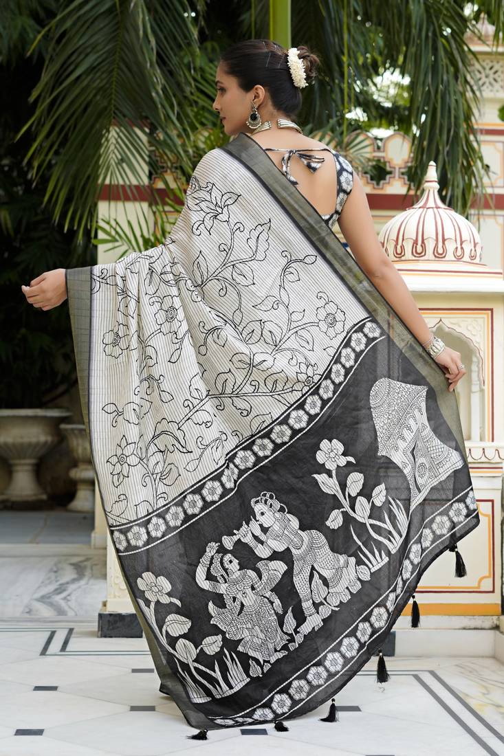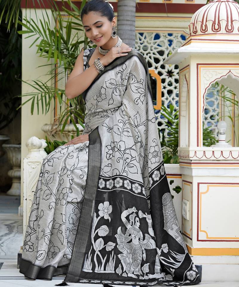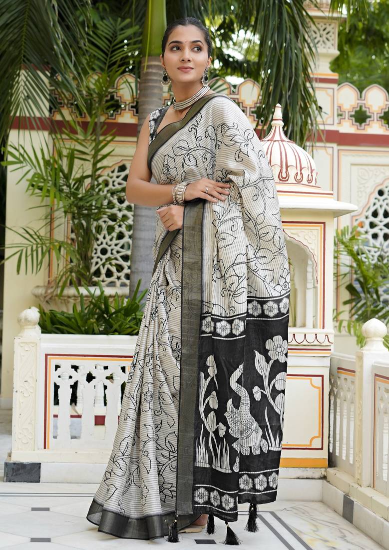Party wear cotton blend floral print saree with unstiched blouse pieceWhite