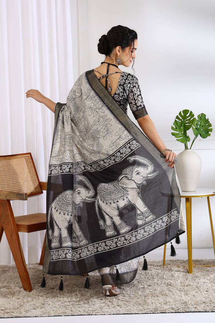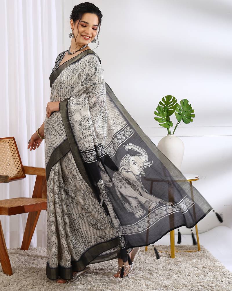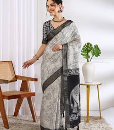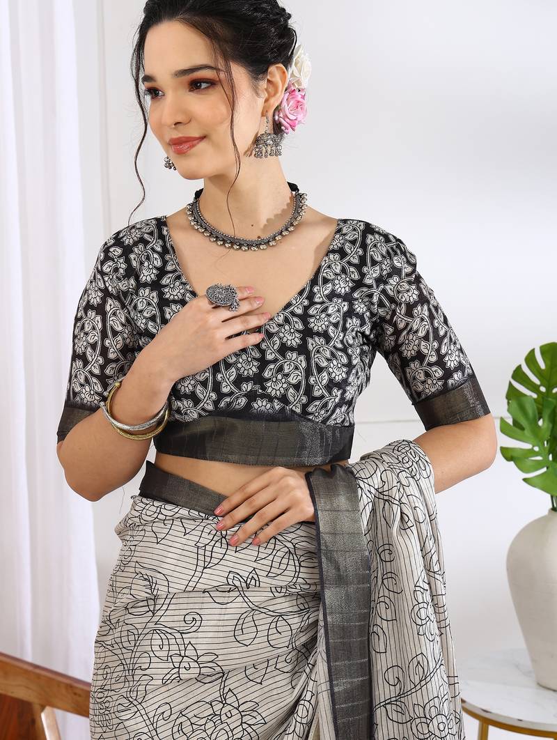 Party wear cotton blend floral print saree with unstiched blouse pieceWhite