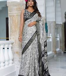 Party wear cotton blend floral print saree with unstiched blouse pieceWhite