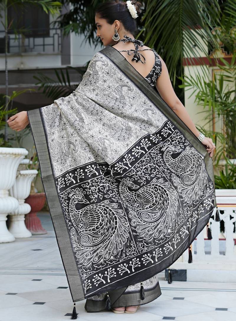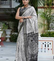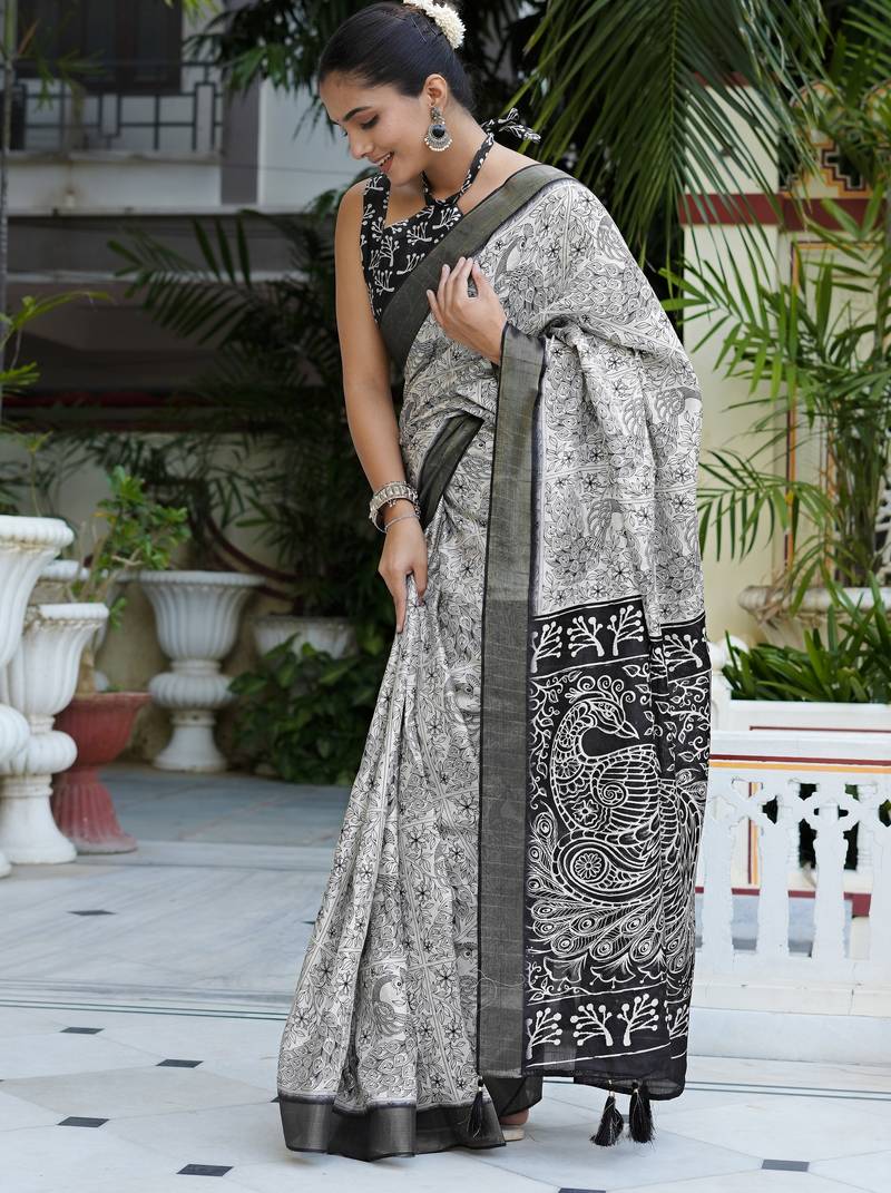 Party wear cotton blend peacock print saree with unstiched blouse pieceWhite