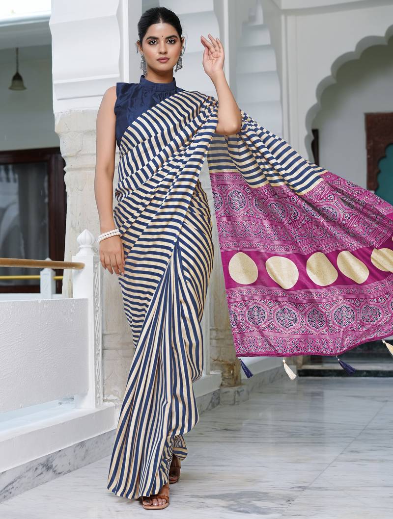 Party wear cotton art silk stripes leheriya saree with unstiched blouse pieceWhite