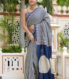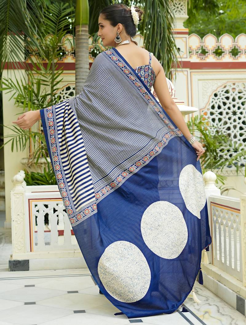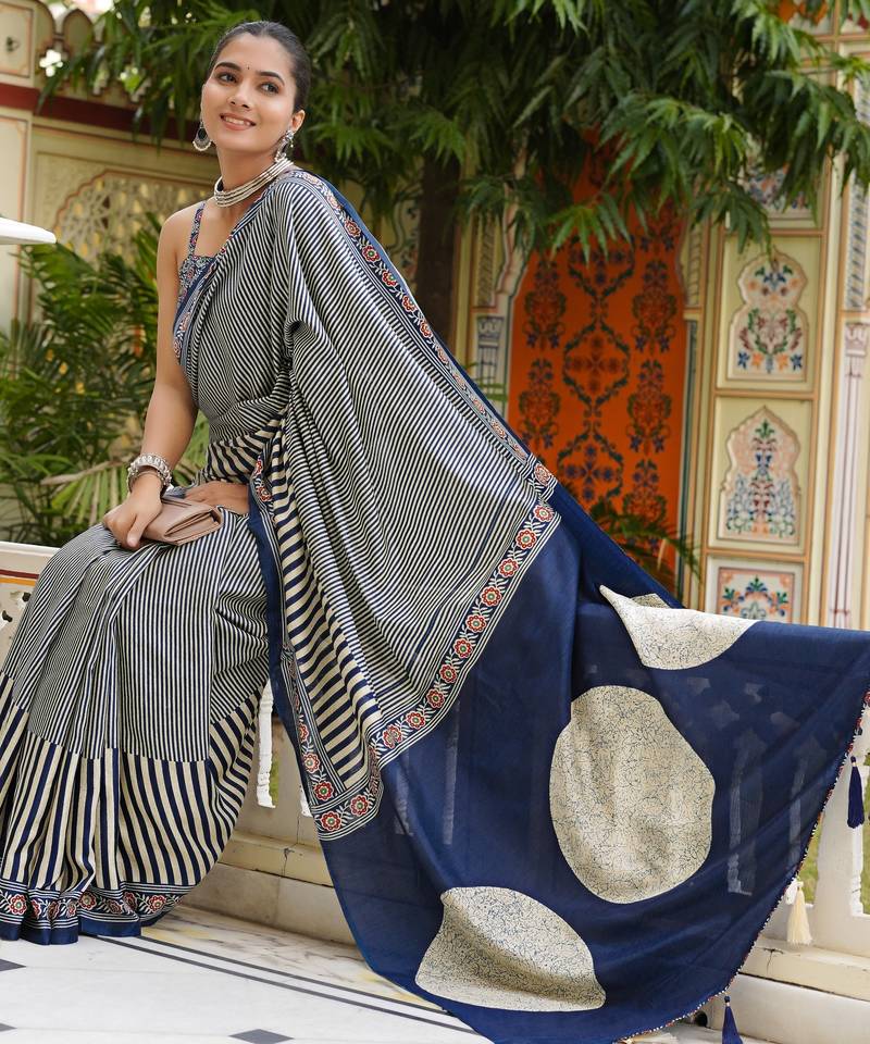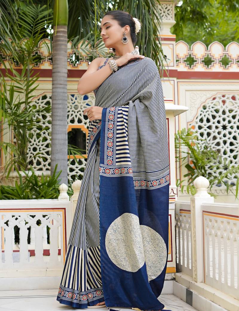 Party wear cotton art silk stripes leheriya saree with unstiched blouse pieceWhite