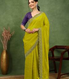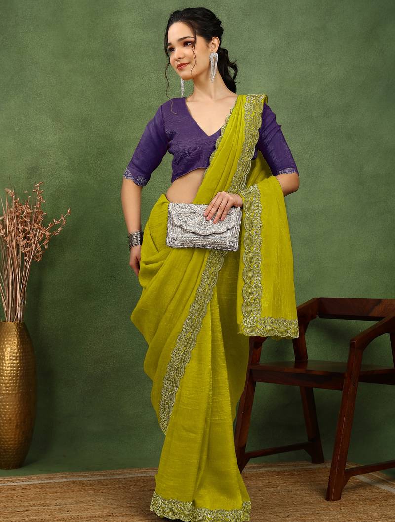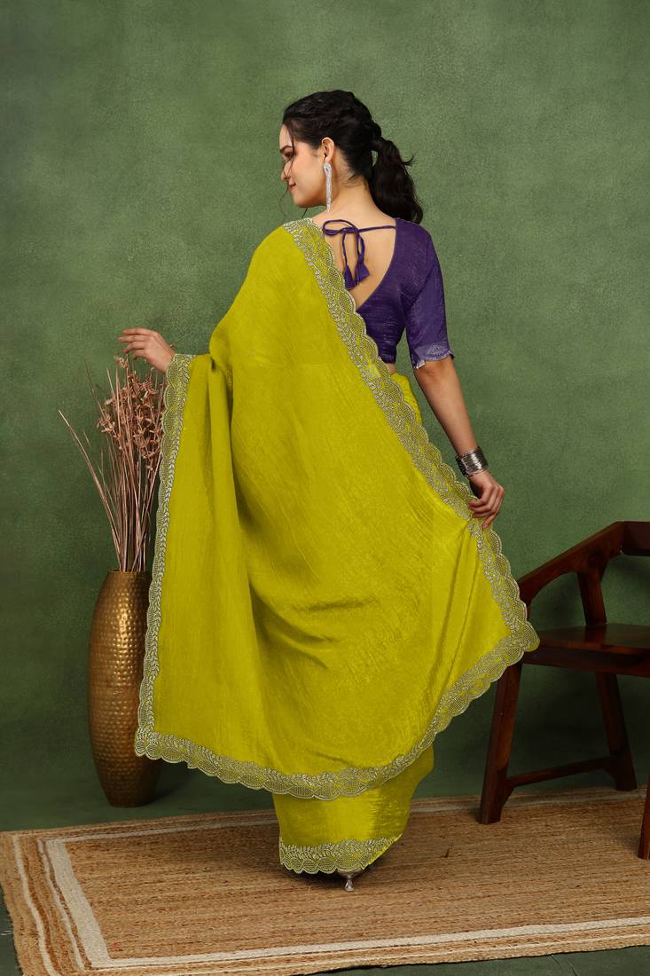 Party wear silk blend crush embellished saree with unstiched blouse pieceDark lime yellow
