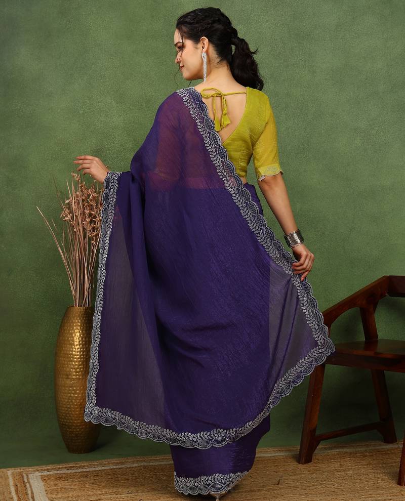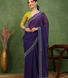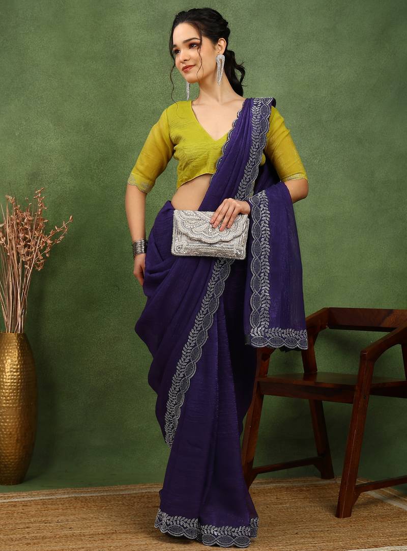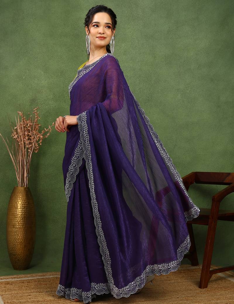 Party wear silk blend crush embellished saree with unstiched blouse pieceDark purple