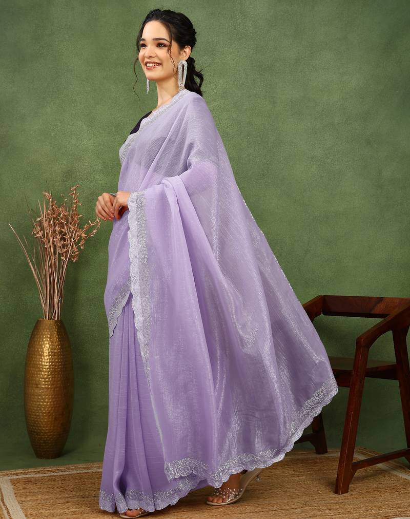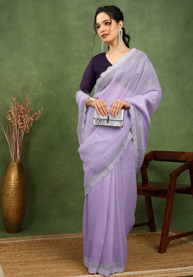 Party wear silk blend crush embellished saree with unstiched blouse pieceLight lavender