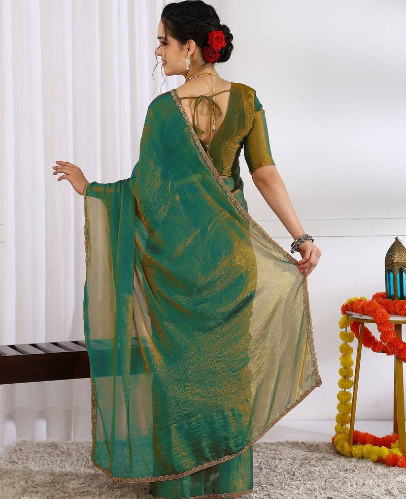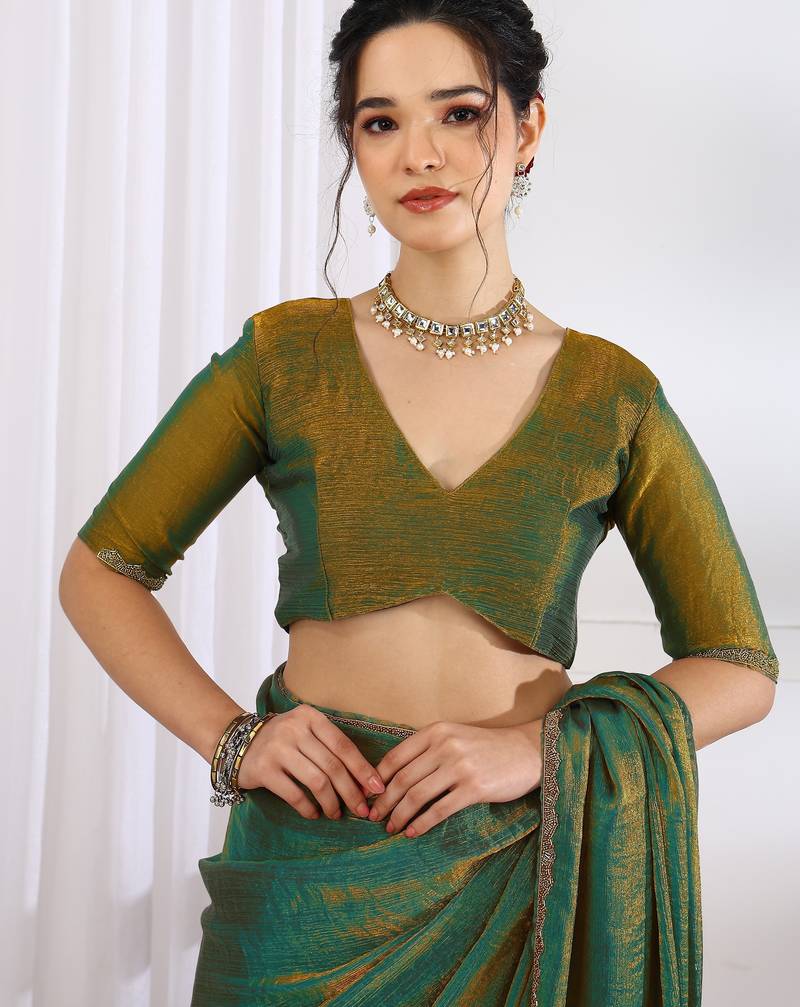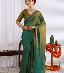 Party wear silk blend zari woven saree with unstiched blouse pieceMehandi green