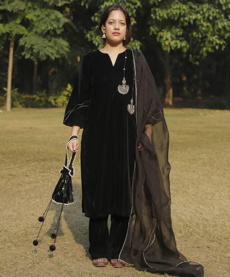 Black velvet chandbali hand embroidered kurta set with dupatta stitched