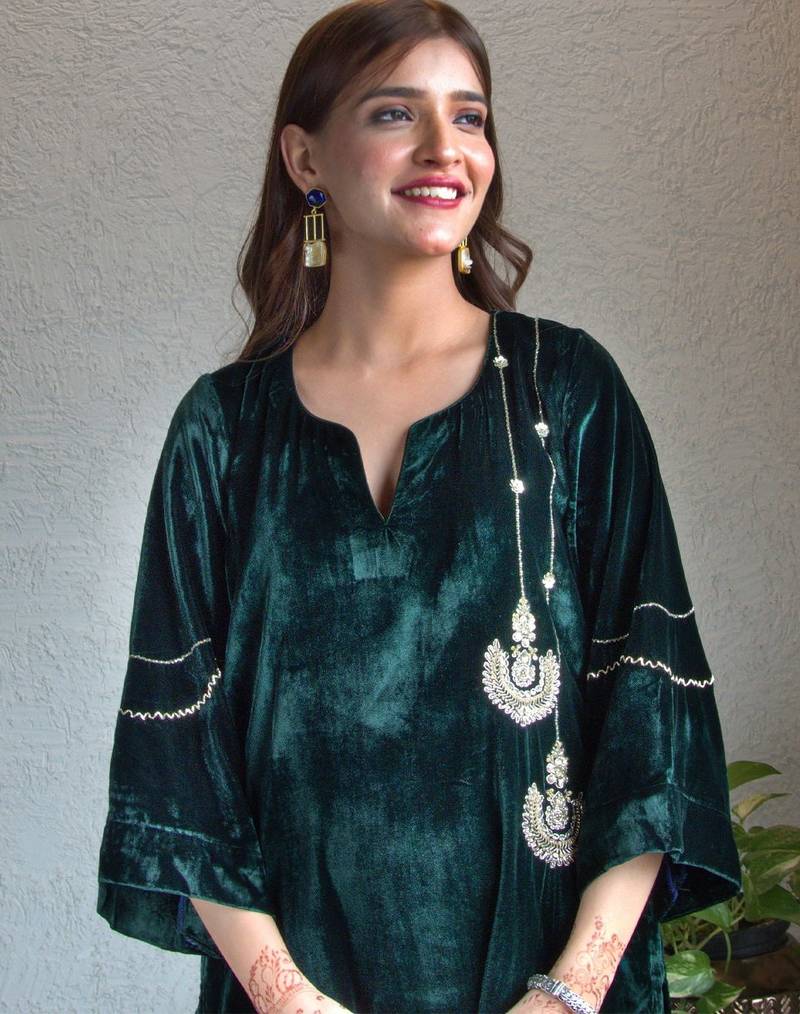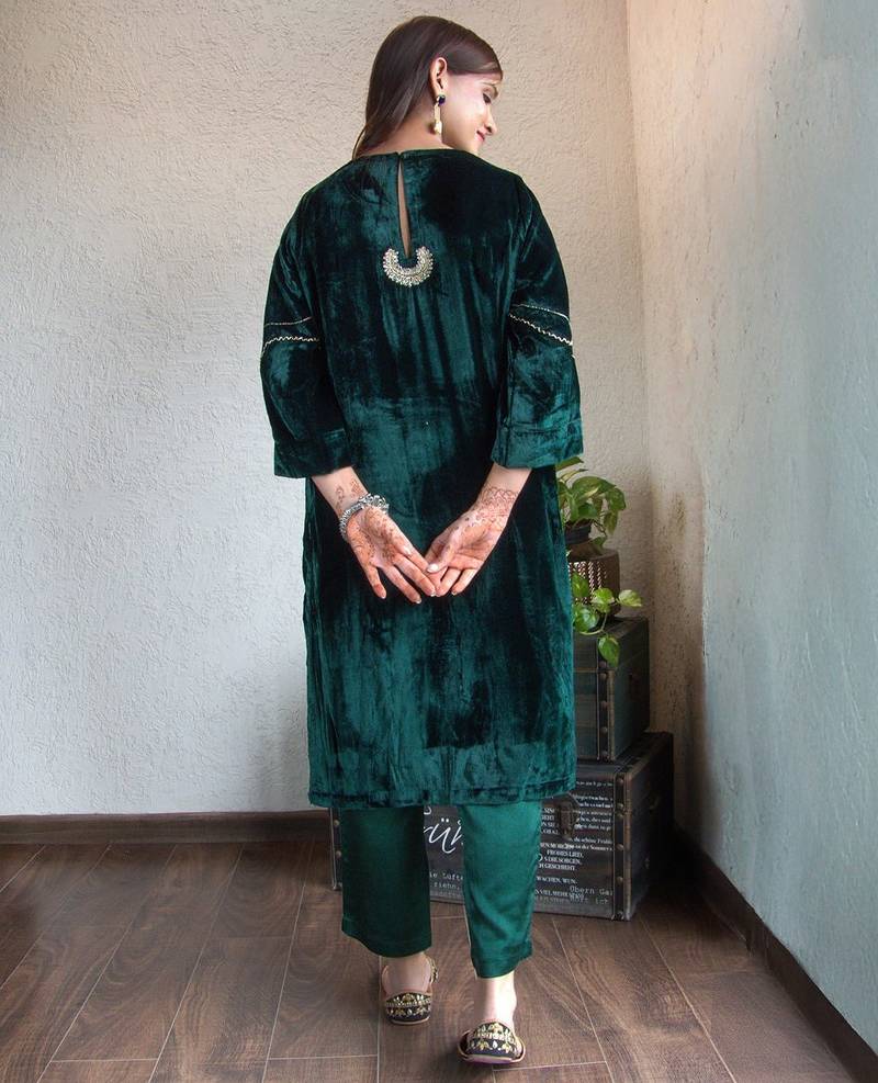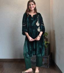 Green velvet chandbala kurta set stitched