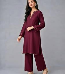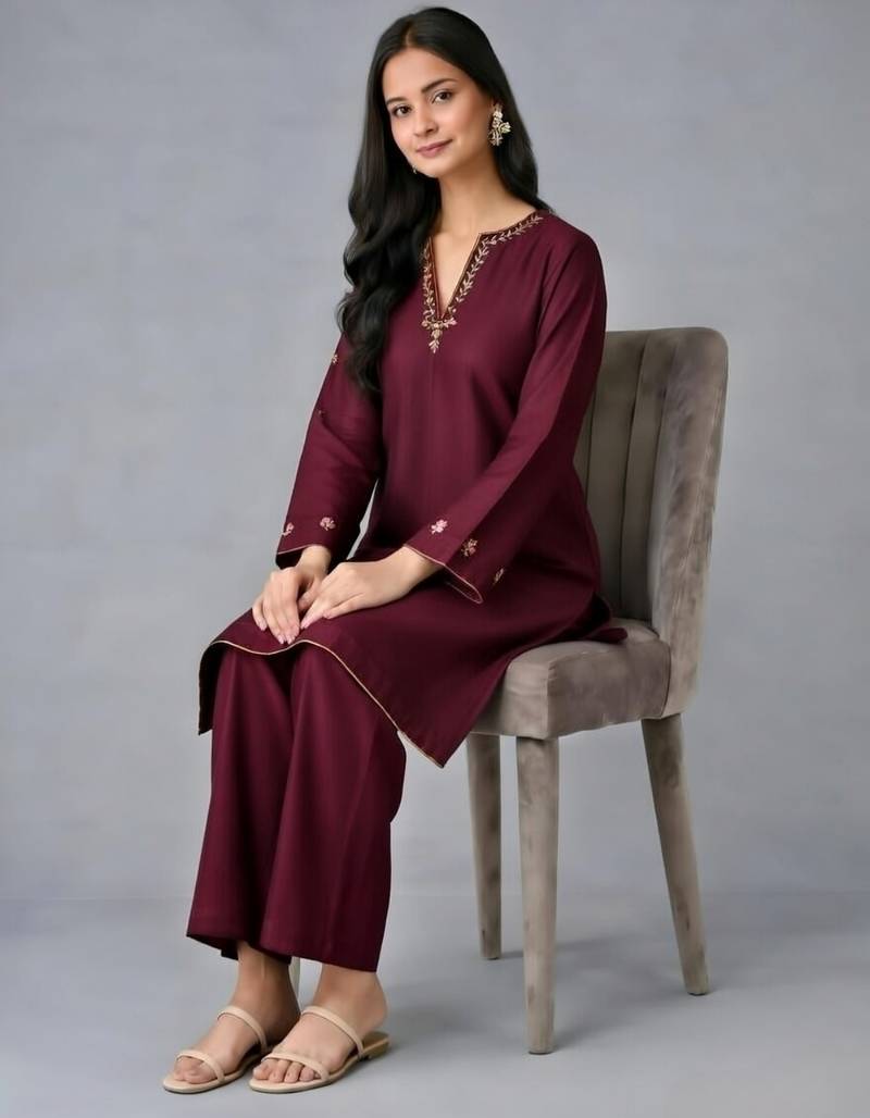Maroon embroidered rayon kurta set stitched