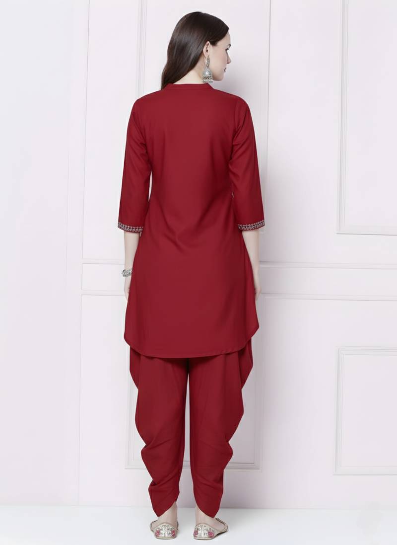 Red embroidered rayon kurta with dhoti pant stitched