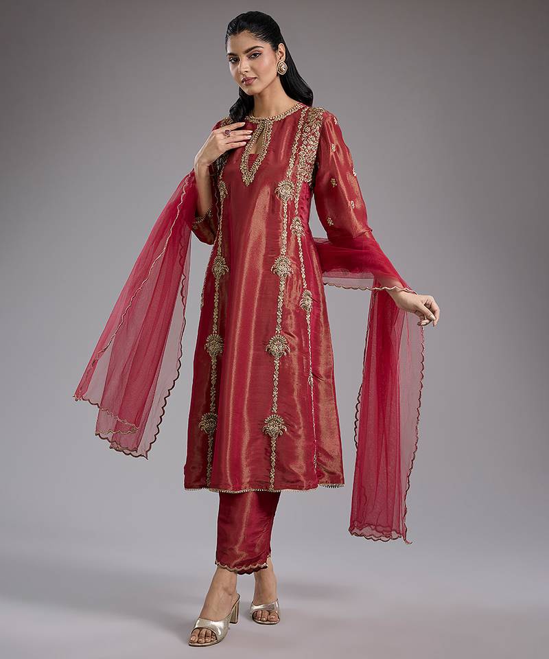 | Product Description | This Red Embroidered Tissue Kurta Set Radiates Vibrant Elegance With Its Lightweight, Shimmery Fabric And Graceful Drape. Intricate Embroidery Adds A Festive, Artisanal Touch, Enhancing Its Traditional Charm. Perfect For Weddings, Celebrations, And Special Occasions, It Blends Comfort With Sophistication, Creating A Stylish And Timeless Ethnic Ensemble.