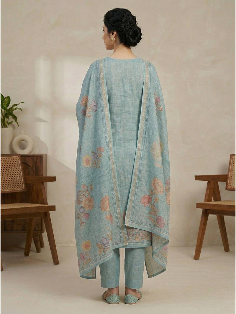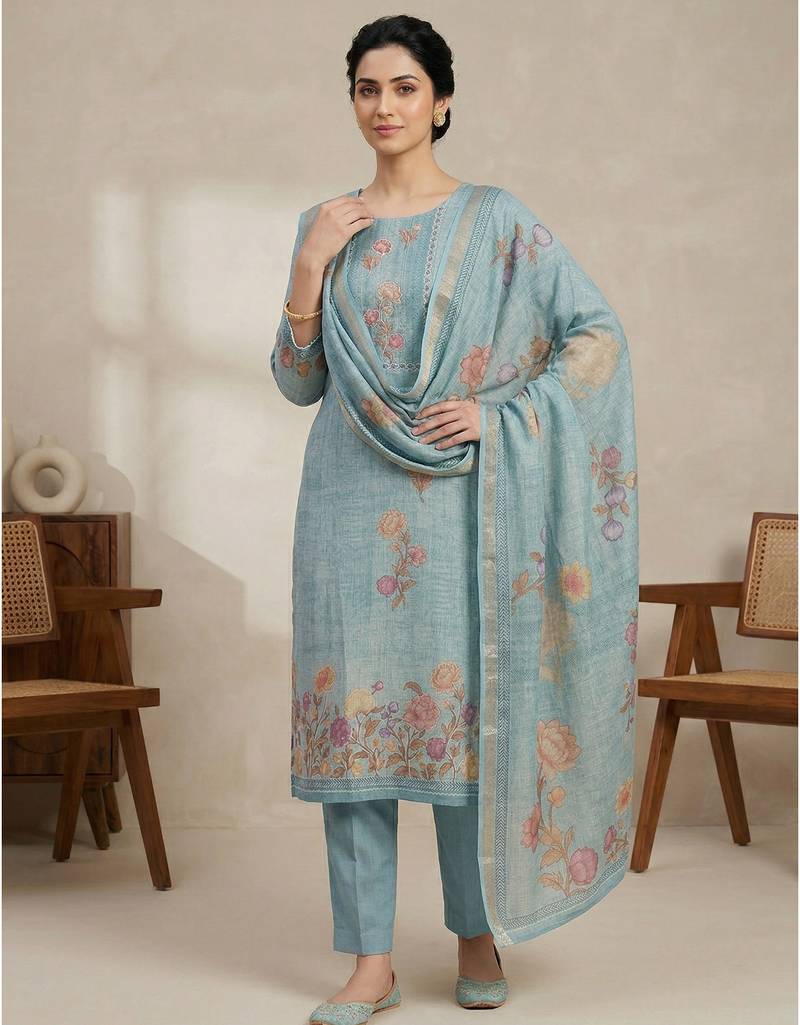 Stylee lifestyle teal linen shimmer digital printed dress material unstitched