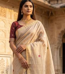 | Product Description | This Beige South Indian Saree Is Crafted From Soft, Pure Cotton That Brings Breathable Comfort And Classic Elegance To Your Ethnic Wardrobe. The Saree Showcases Graceful Meenakari Weaving Touch Up Motifs Across The Body, Paired With A Rich Floral Pallu Detailed With Intricate Zari Weaving And Delicate Tassels At The End For An Authentic Traditional Finish. A Contrasting Cotton Blouse Piece With Woven Sleeve Border Is Included, Ready To Be Tailored For Your Perfect Fit. Ideal For Festivals, Cultural Celebrations, Or Casual Ethnic Wear, This Saree Combines Timeless South Indian Charm With Versatile Comfort, Making It A Must Have Among Classic South Indian Sarees And Sarees For Every Occasion. |