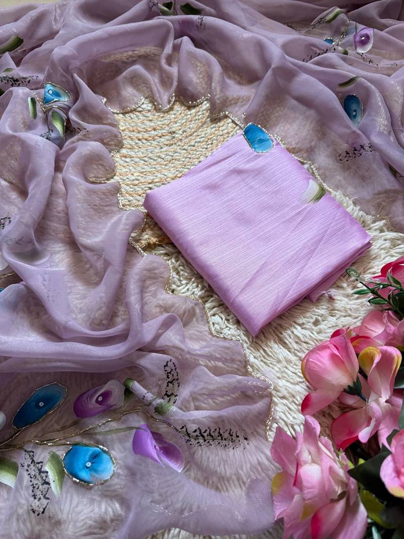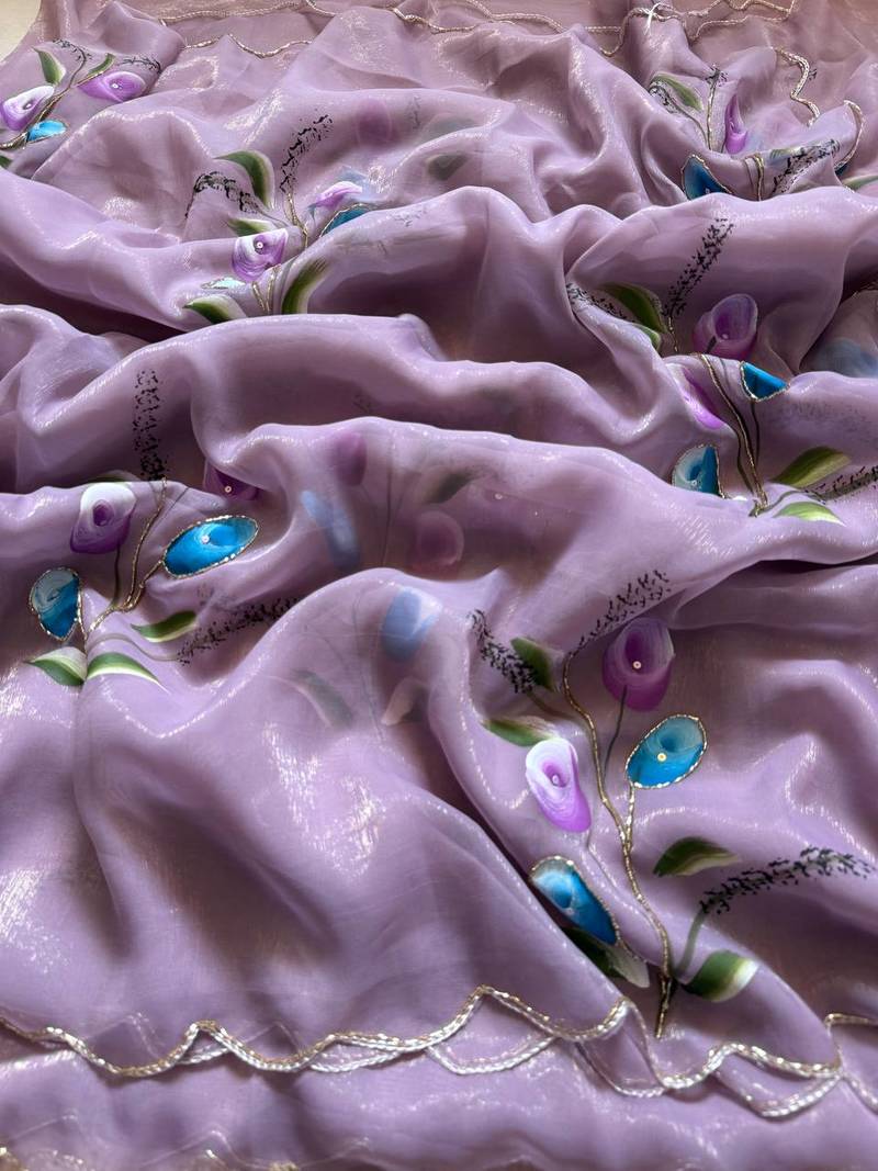 | Product Name | Lavender Color Elegant Flower Handprint & Brush Print Work Silk Saree | |