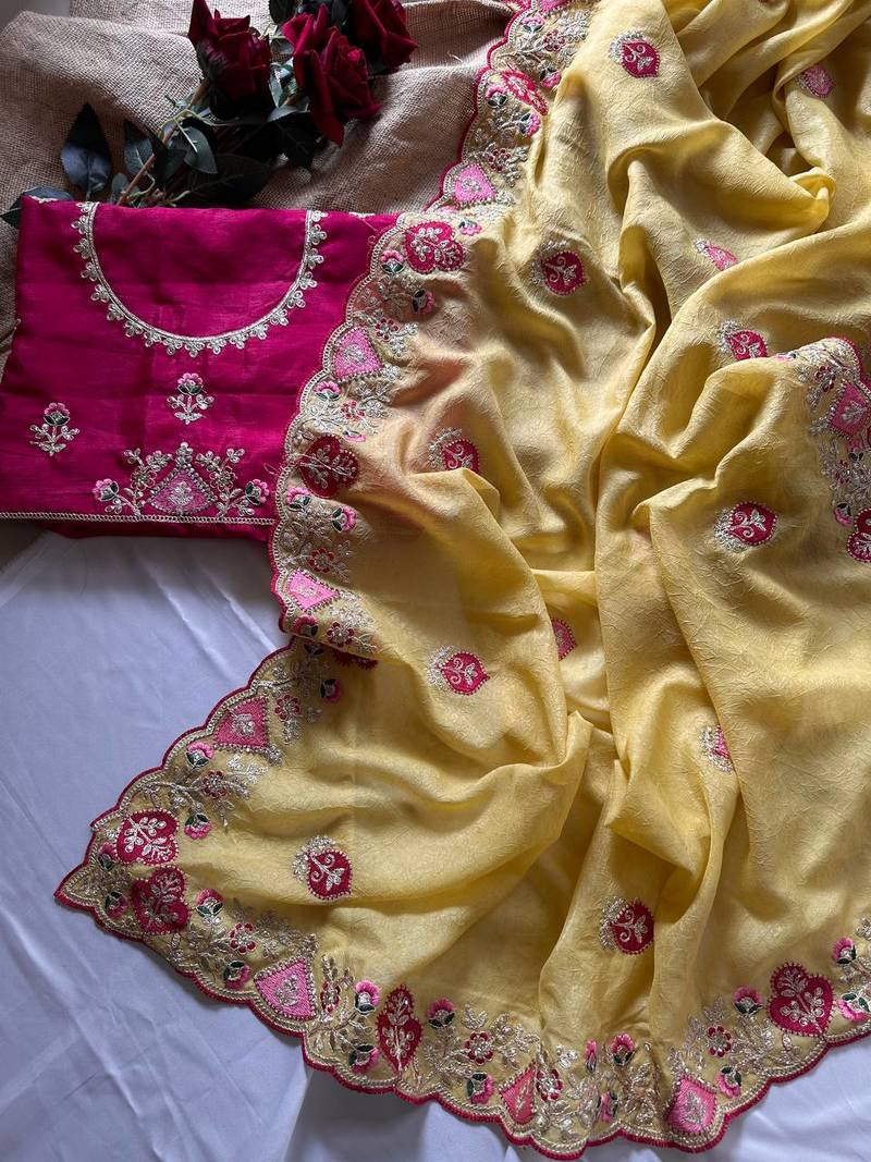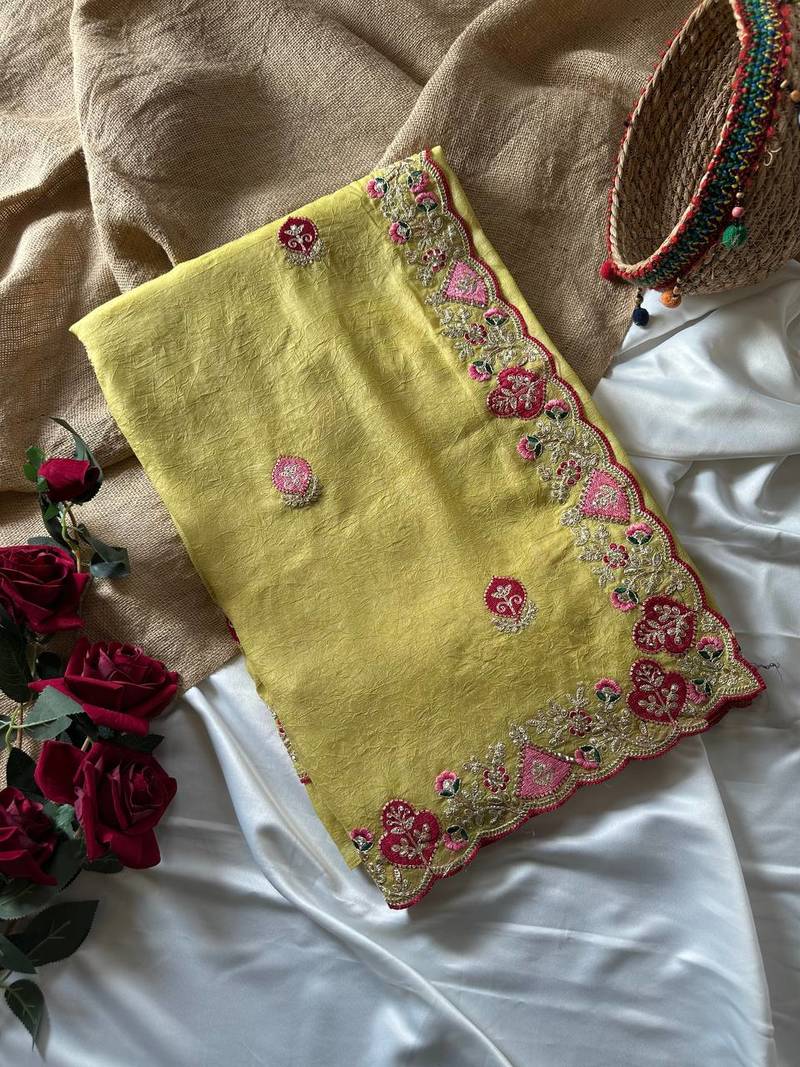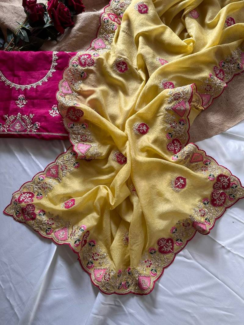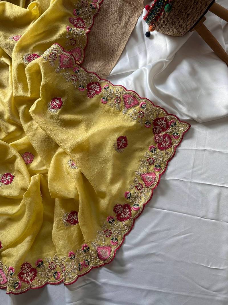 | Product Name | Light Yellow Color Zari Border With Zarkhan Work Georegett Saree | |
