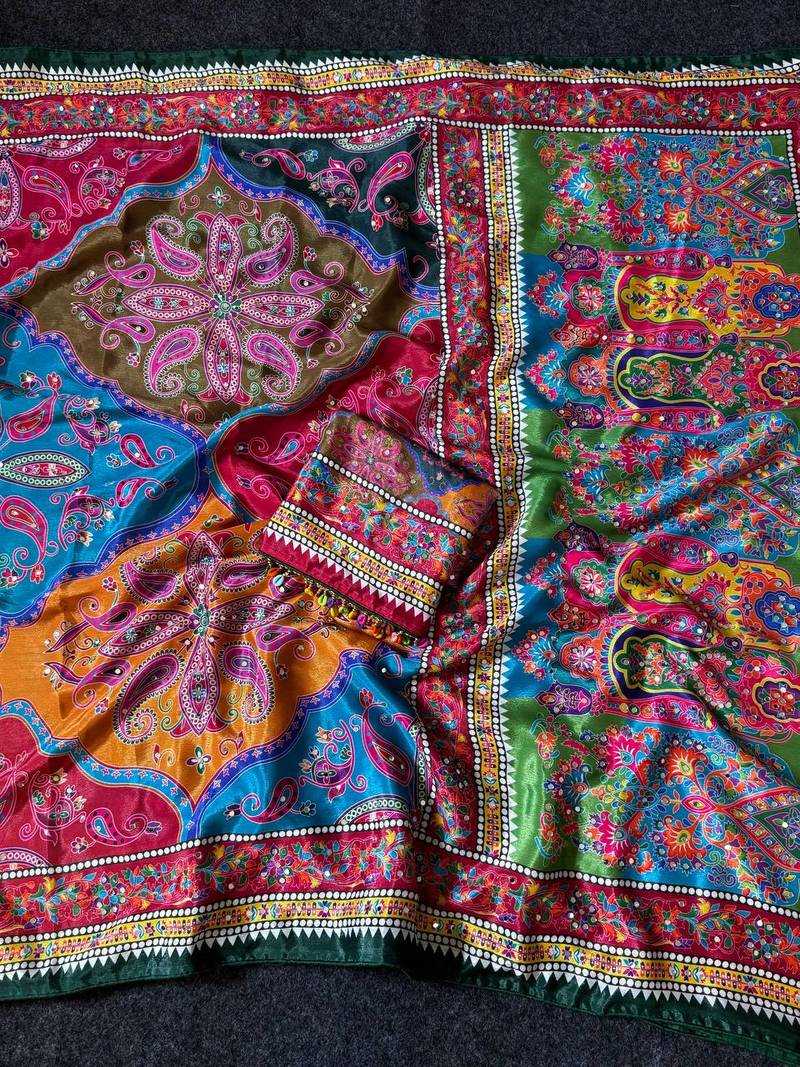 | Product Description | Fabric: Roman Silk With Ajarakh Print And All Saree Real Mirror Work And Piping Saree Border Blouse: Roman Silk With Ajarakh Print With Real Mirror In Blouse |