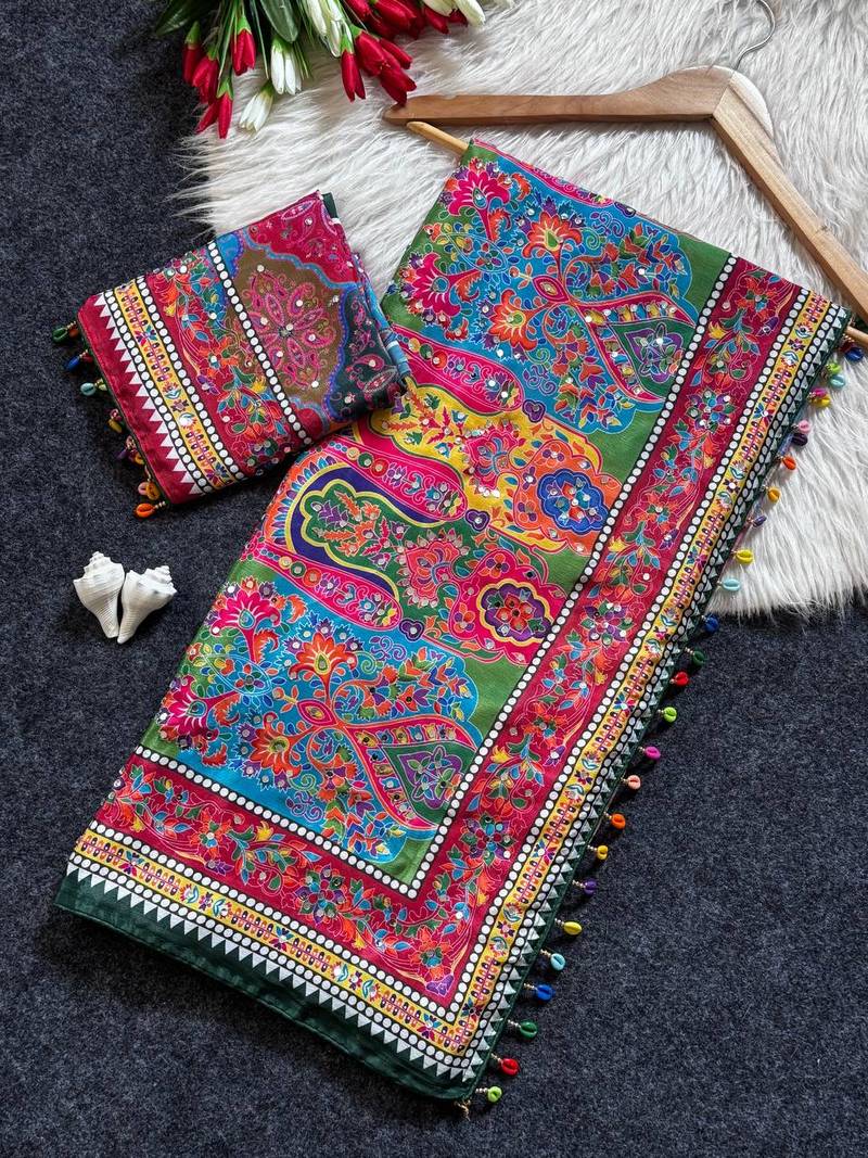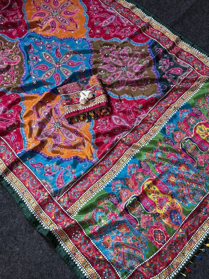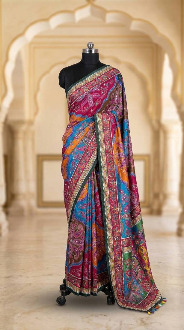 | Product Name | Multi Color Mirror Work And Piping Saree Border And Ajarakh Print Roman Silk | |