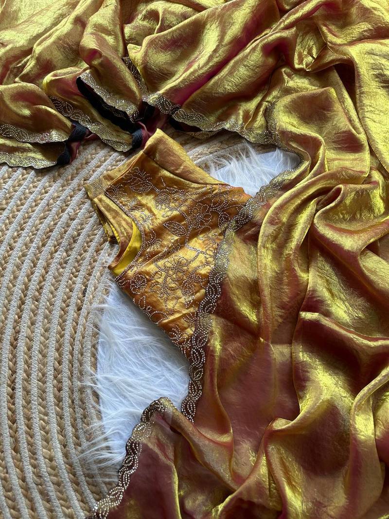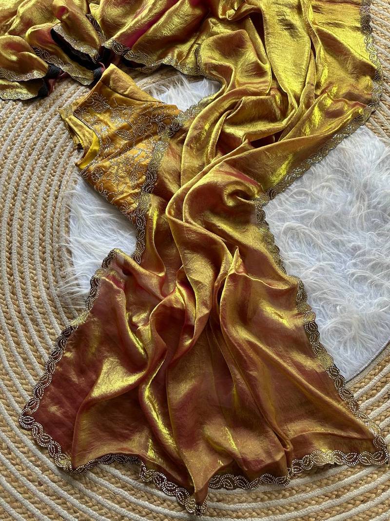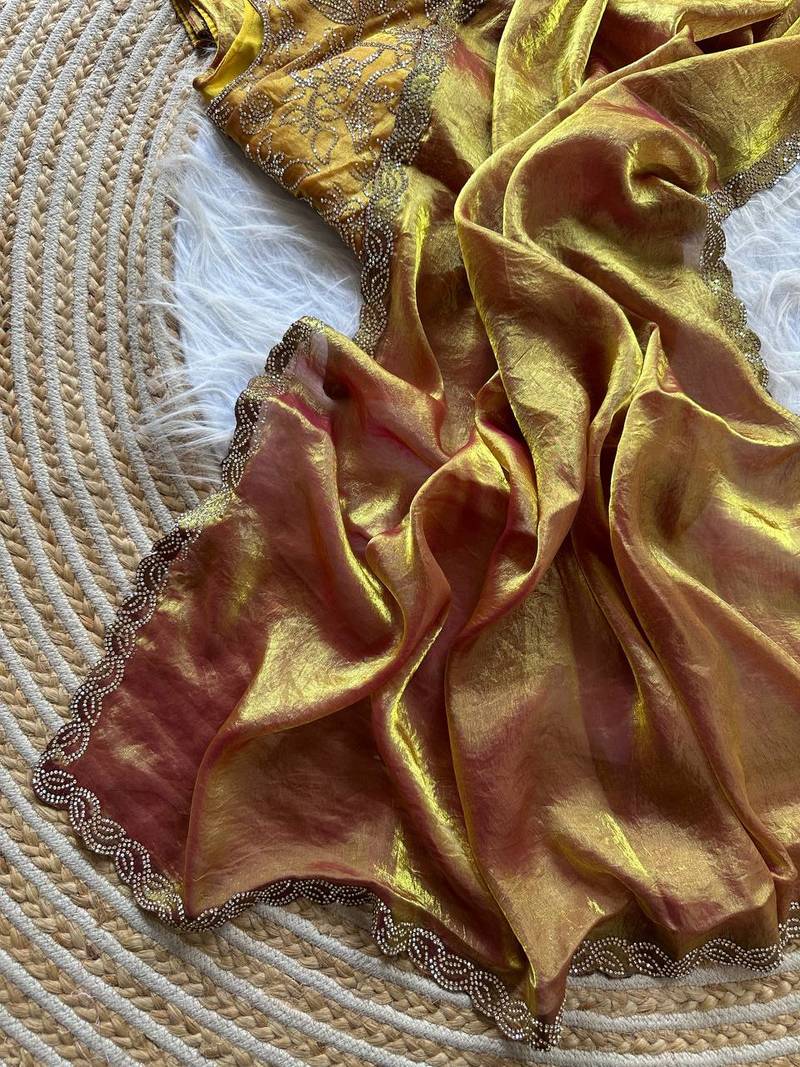 mustard satin silk saree with jarkhan diamond work