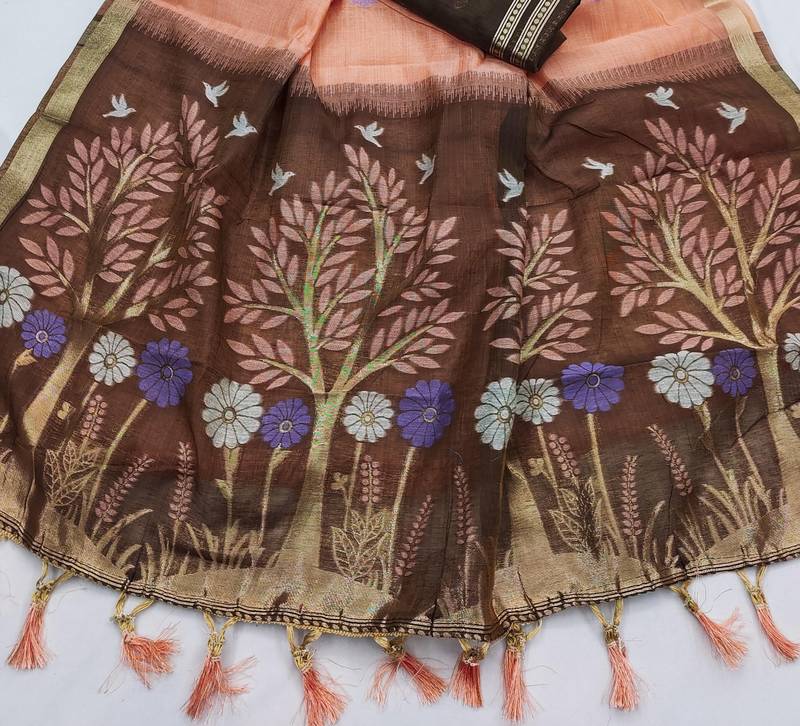 Peach color meenakari weaving touchup work muga cotton saree