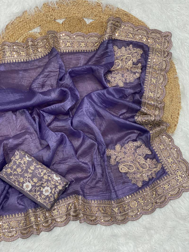 Purple color embroidered glass tissue fabric saree