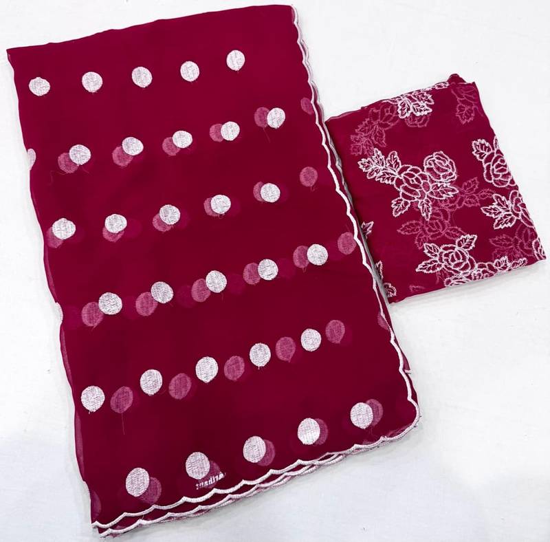 | Product Description | Fabric: Primium Soft Georgette With Polka Dot Thread Work And Scalp Border Blouse : Georgette With Heavy Thread Work All Over It’s Primium Designer Collection With Pure Fabric And Pure Border |