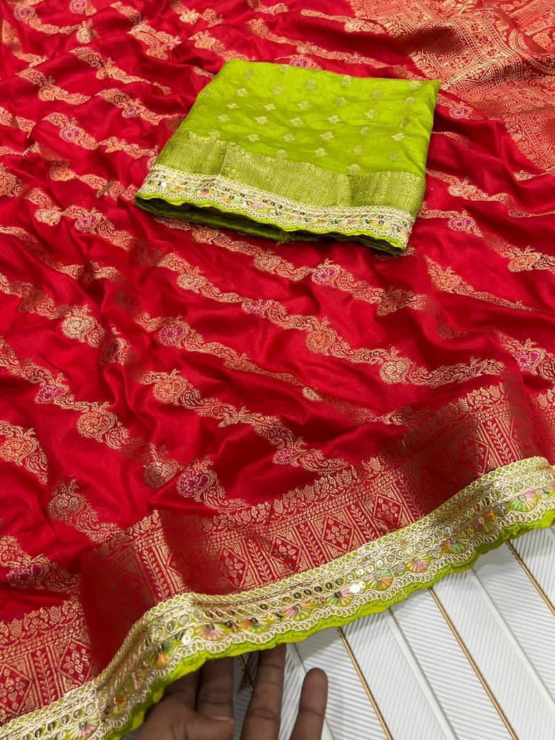 | Product Name | Red Color Designer Dola S Ilk Blnd Zari Weaving Saree | |