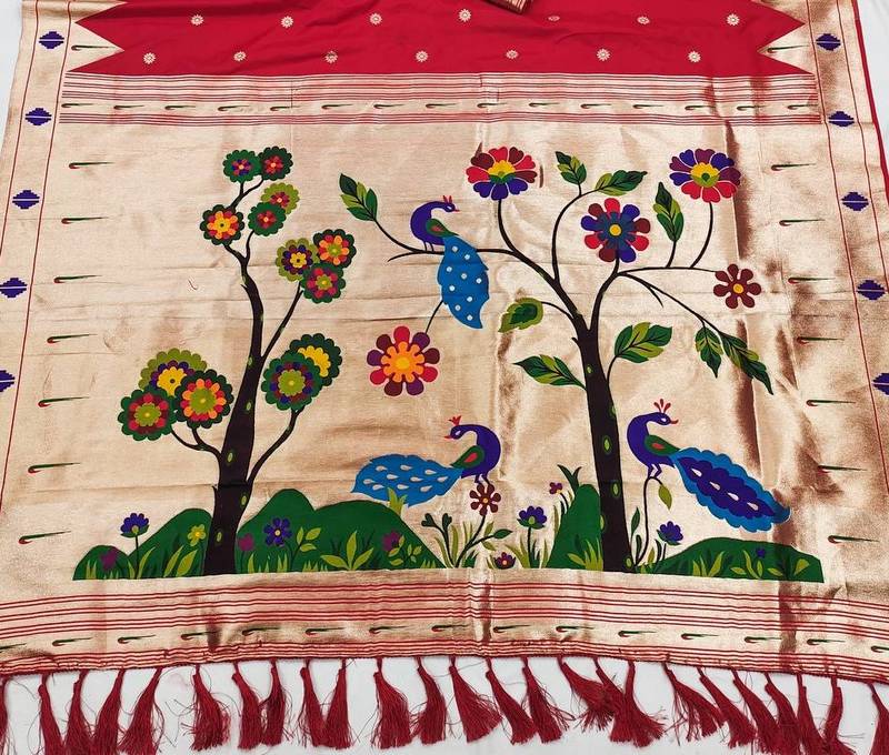 Red color meenakari weawing border & tessels attache pethani silk saree d work