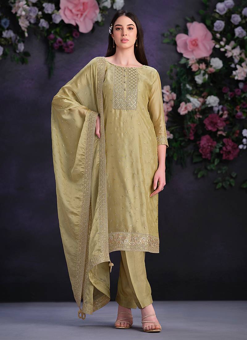 Beige embroidered & jarkan shimmer organza straight cut suits salwar kameez semi stitched