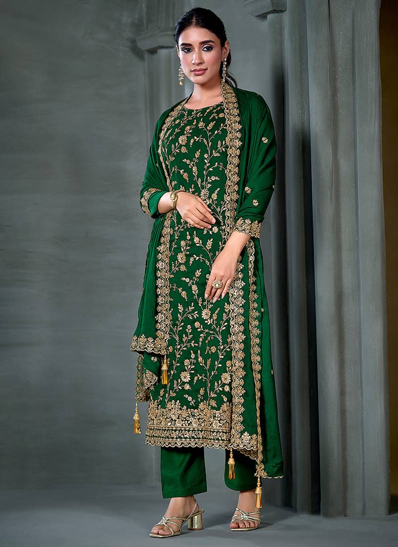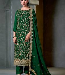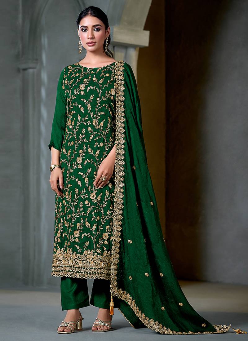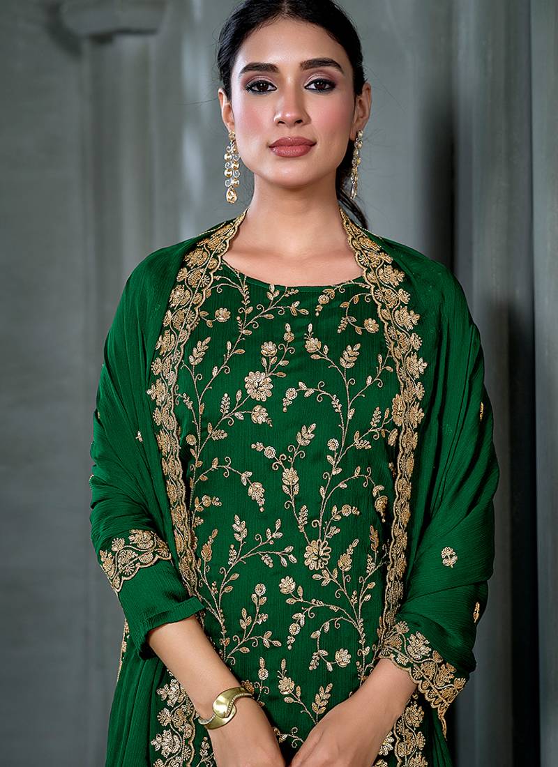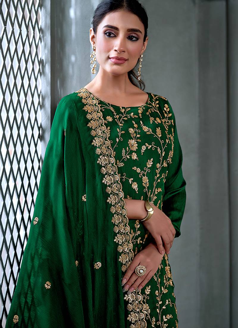 Green embroidered & hand work satin chiffon straight cut eid wear salwar kameez for women semi stitched