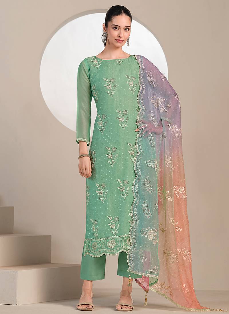 Green embroidered & jarkan work organza straight cut suits semi stitched