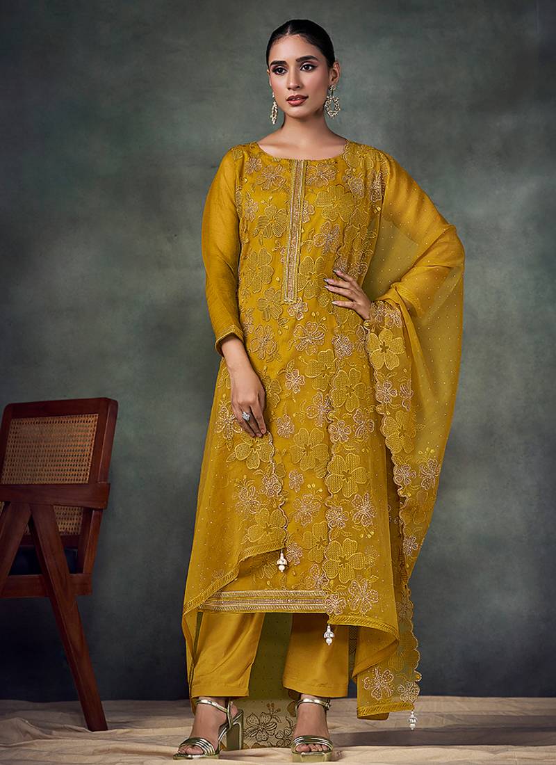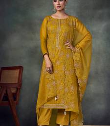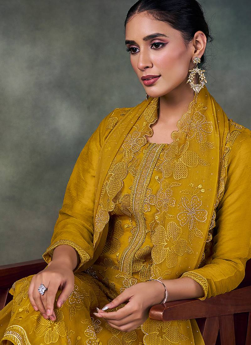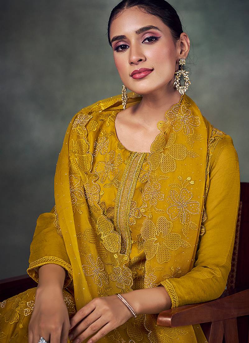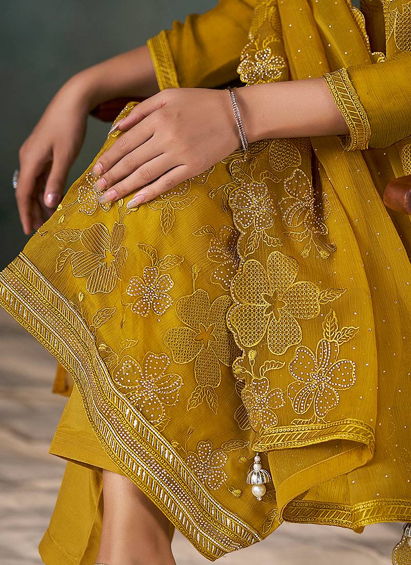 Mustard embroidered & swarovski chiffon straight cut eid wear salwar kameez semi stitched