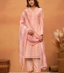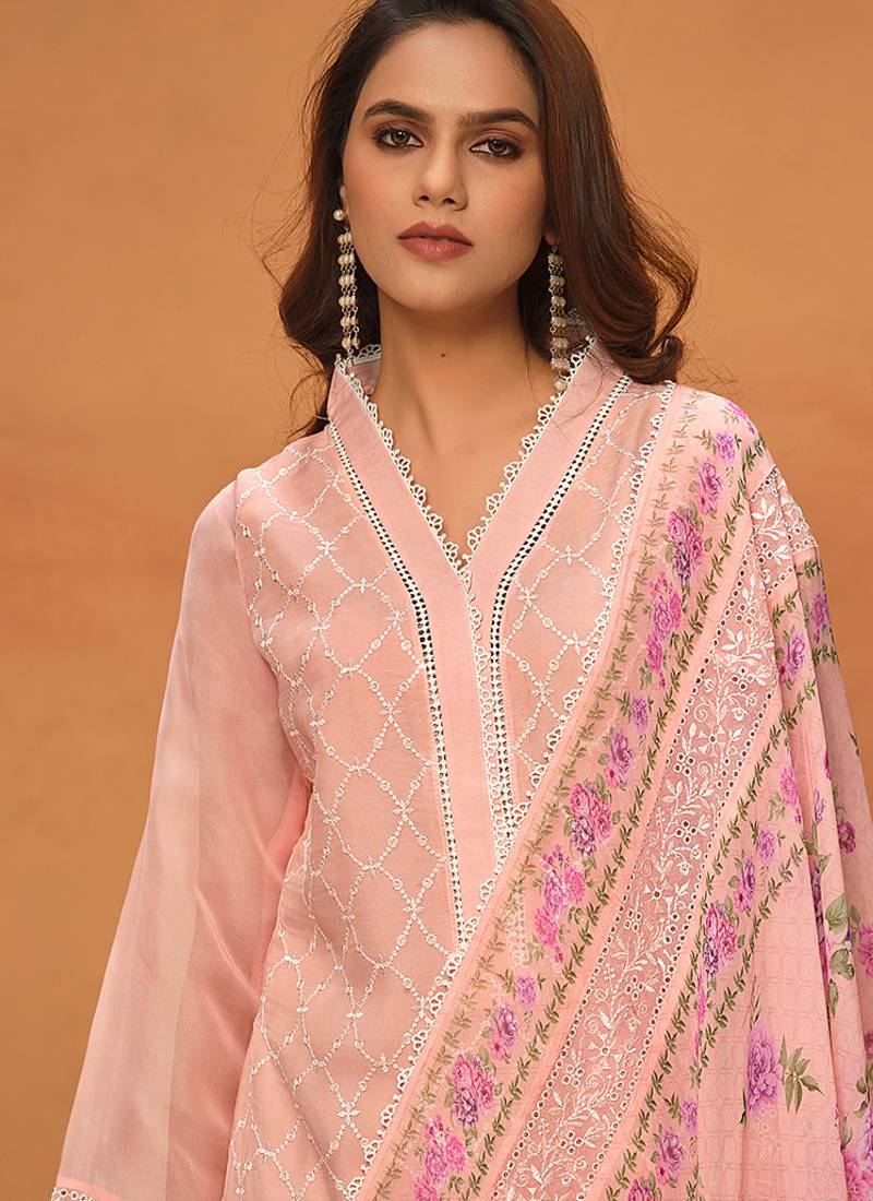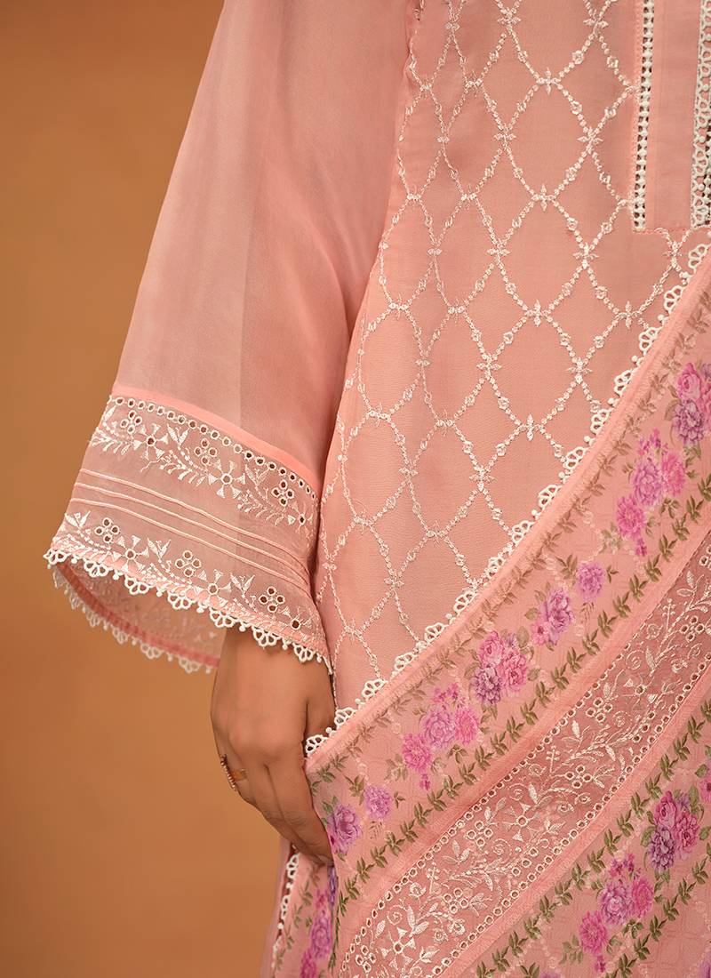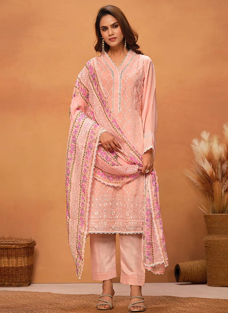 Peach chikankari viscose organza straight cut party wear salwar kameez semi stitched