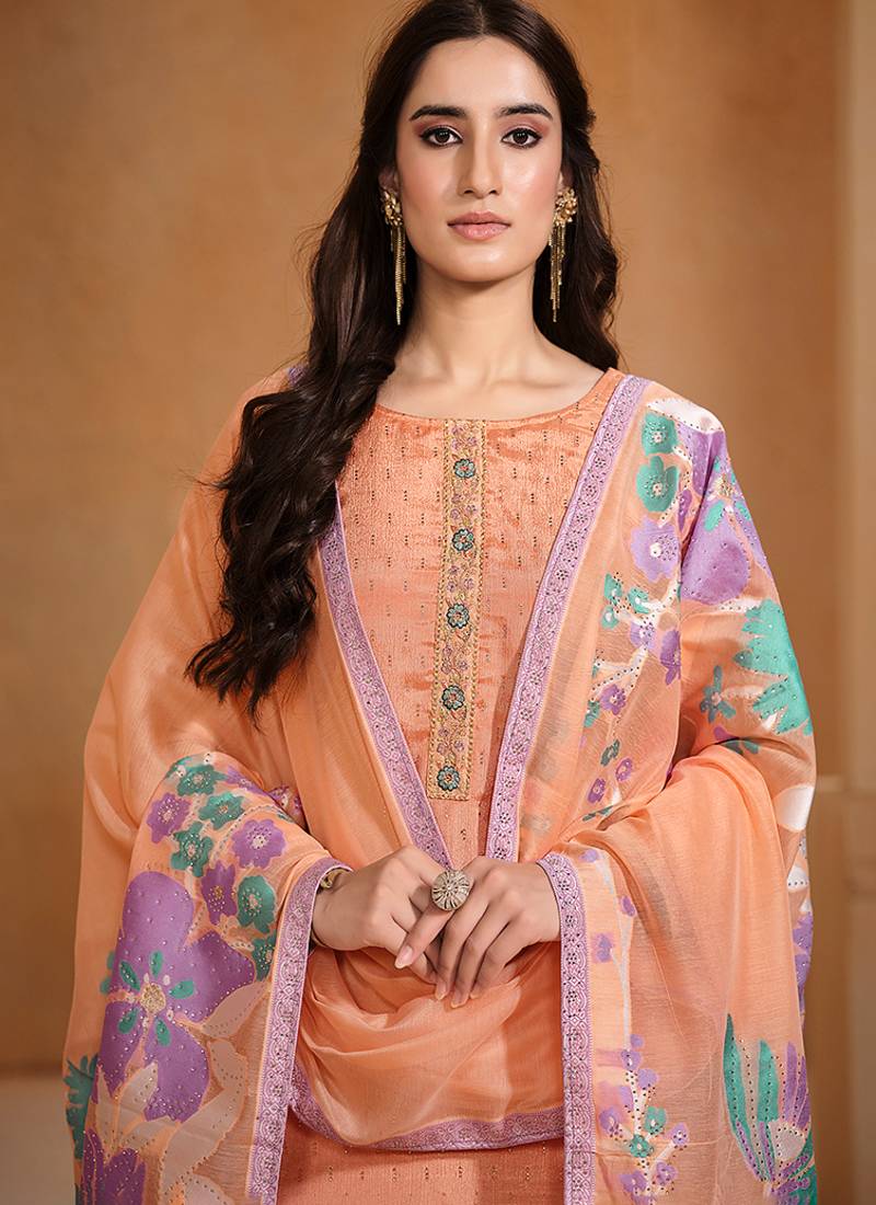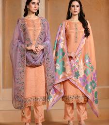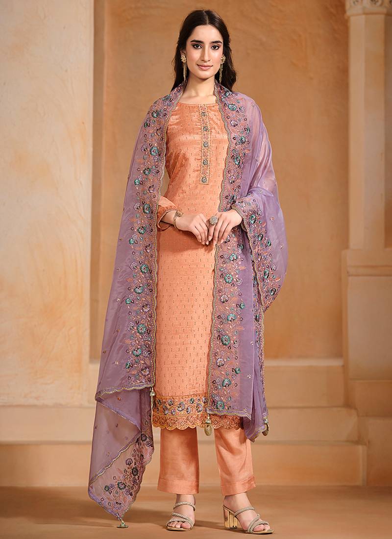 Peach embroidered & swarovski chiffon straight cut salwar kameez dubble dupatta semi stitched