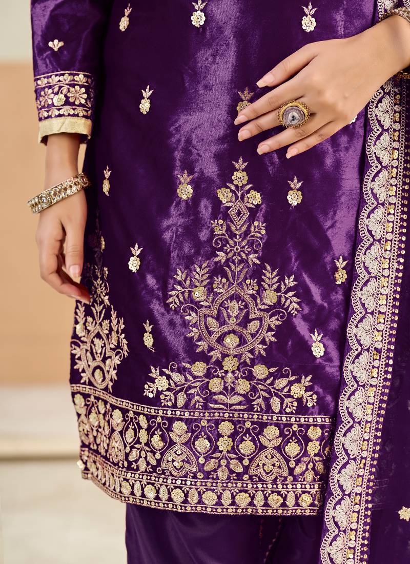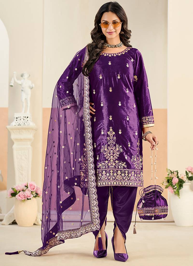Purple embroidered sequence velvet dhoti style semi stitched